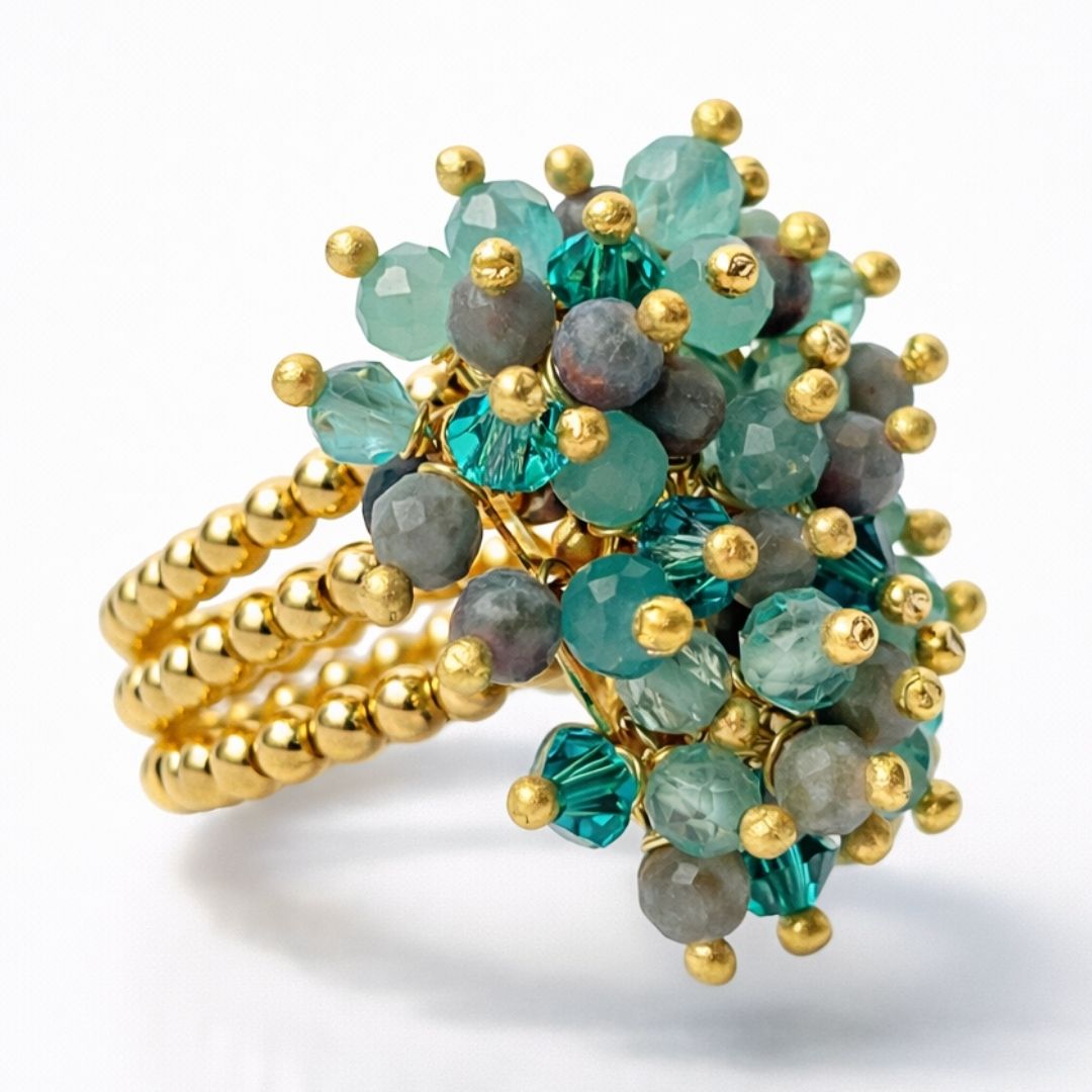 Anel banhado a ouro 18k com pedras de fuchsita, apatita e cristais austríacos. Estruturado com fibra elástica de poliéster, garantindo encaixe confortável e ajustável.