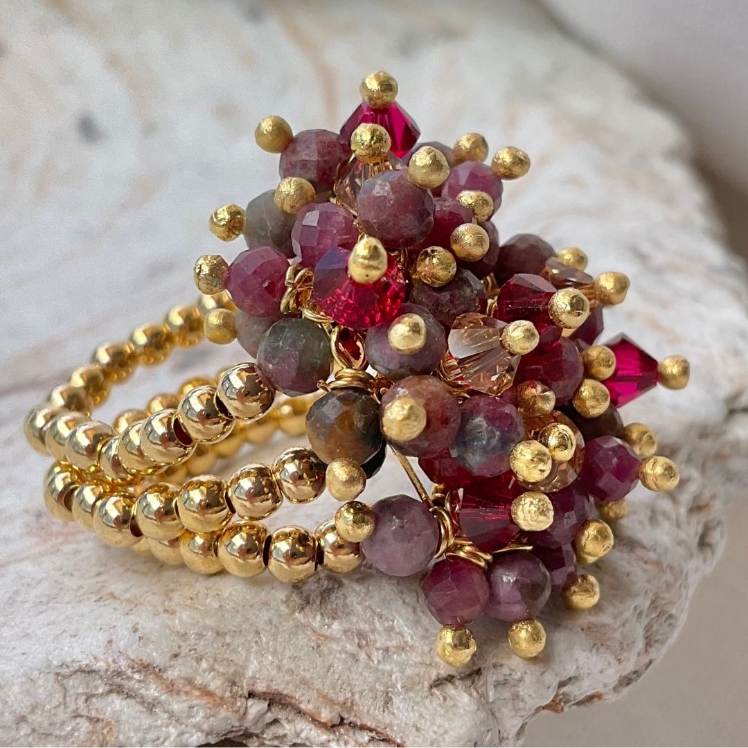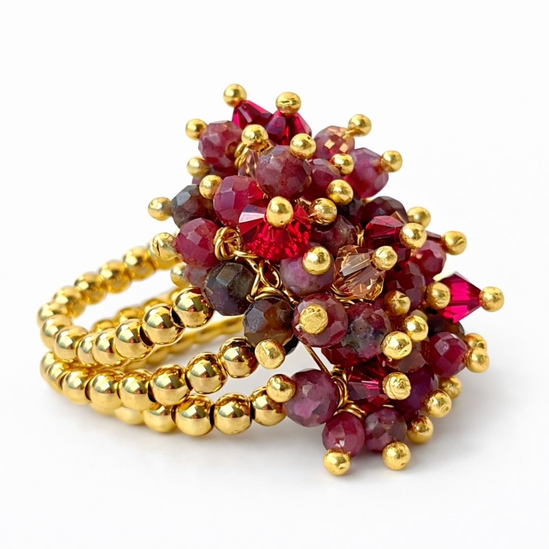 Anel banhado a ouro com rubelita, fuchsita e cristais austríacos, formando um buquê intenso em tons de rosa e verde — como as buganvílias que se derramam pelos terraços de Ravello com a luz do fim de tarde.