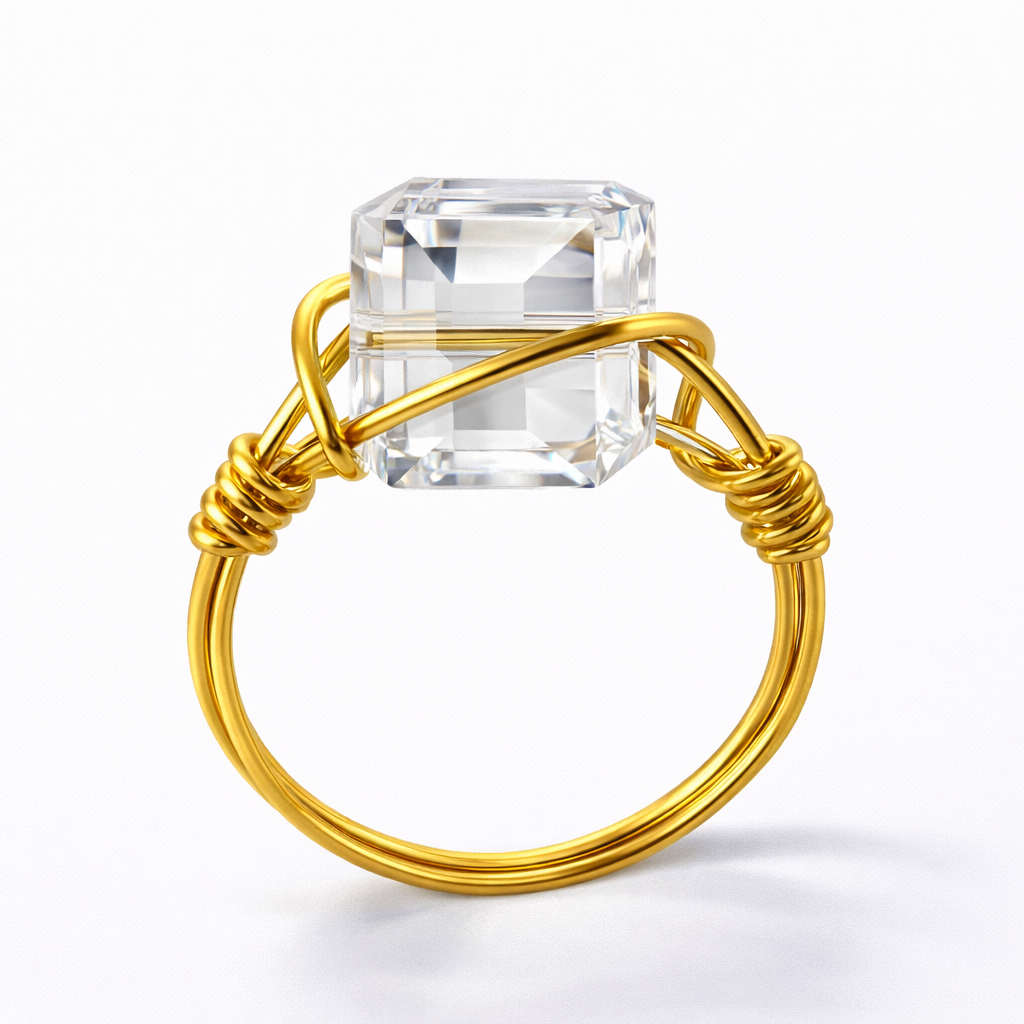Anel artesanal de design minimalista, feito com fio banhado a ouro 18k e cristal austríaco em cubo facetado 10 mm — leve, delicado e marcante.