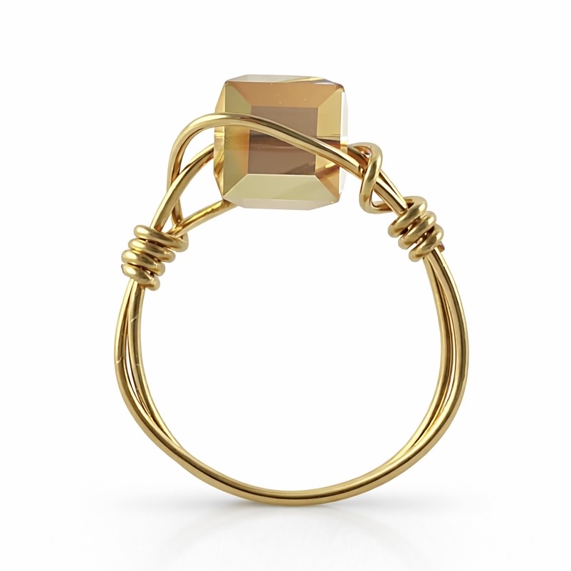 Anel artesanal banhado a ouro 18k, estruturado com fio resistente e delicadamente finalizado à mão. No centro, um cristal austríaco cúbico de 8 mm na cor Copper — um tom âmbar sofisticado, com reflexos quentes que variam entre mel, dourado e cobre metalizado, criando um brilho profundo e elegante.