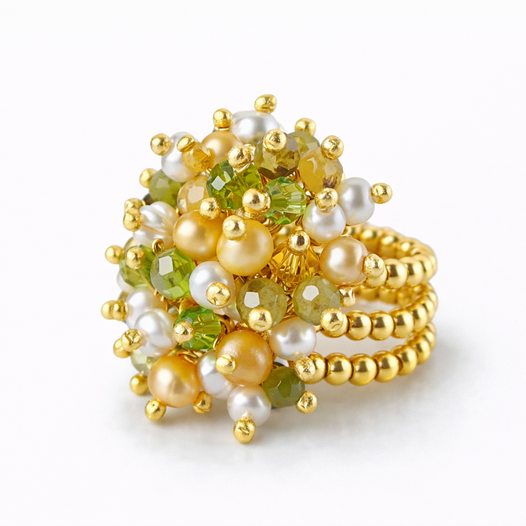 Anel banhado a ouro com granada grossular, pérolas barrocas e cristais austríacos. Inspirado no frescor cítrico do verão amalfitano, combina tons de limão, dourado e branco em uma joia luminosa e artesanal.