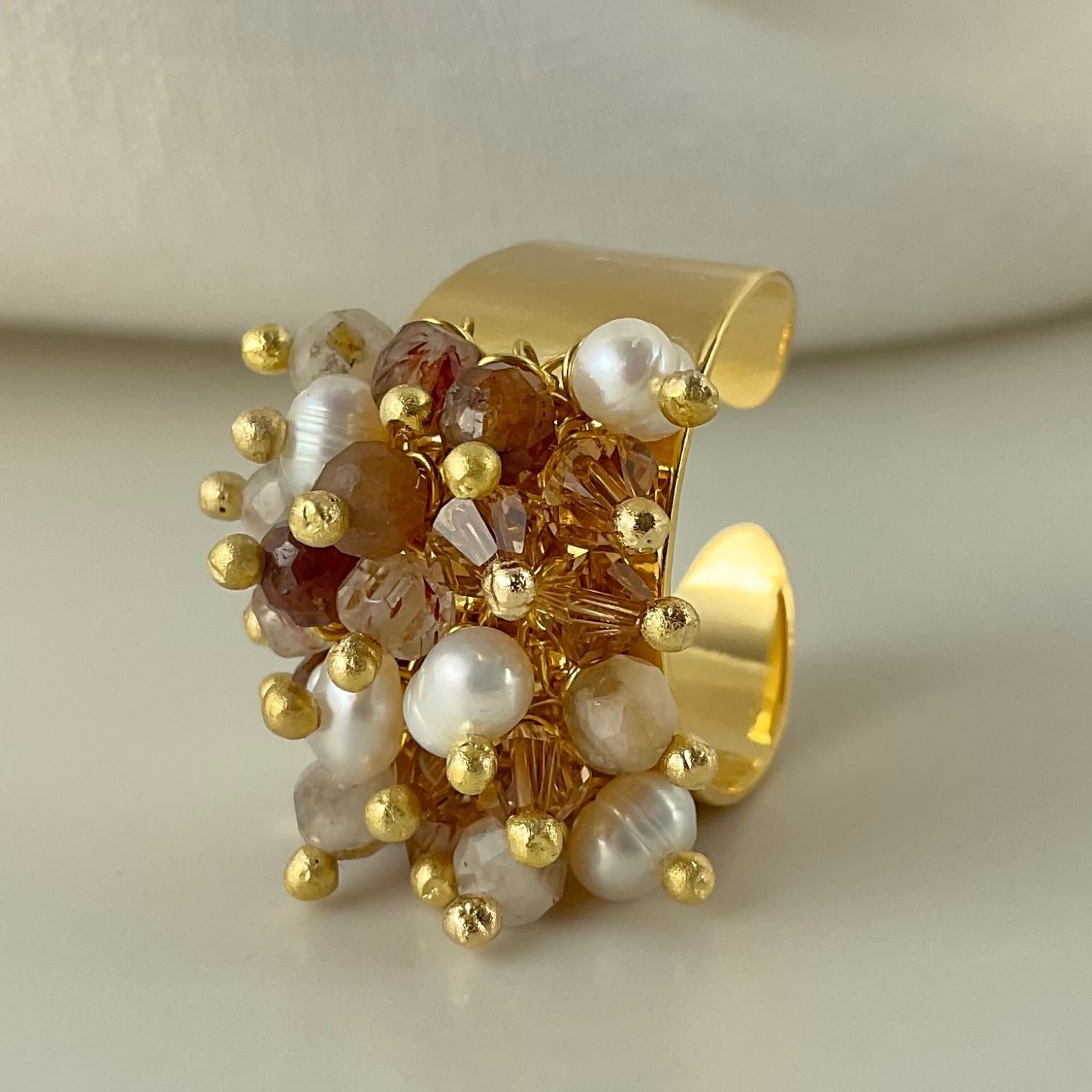 Evocando as luzes douradas de Amarna, este anel mistura os tons mel da safira amarela e do quartzo rutilado ao brilho sedoso das pérolas barrocas e dos cristais austríacos, em volume autoral banhado a ouro.