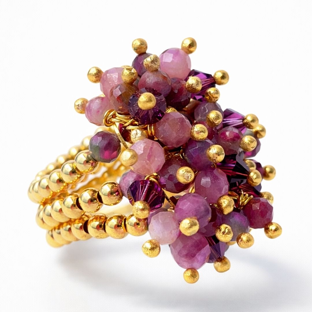 Anel banhado a ouro com pedras de rubelita, fuchsita e cristais austríacos que trazem brilho sutil em tons florais. A composição intensa e orgânica das pedras lembra a delicadeza dos jardins mediterrâneos cobertos por bouganvilles em flor.