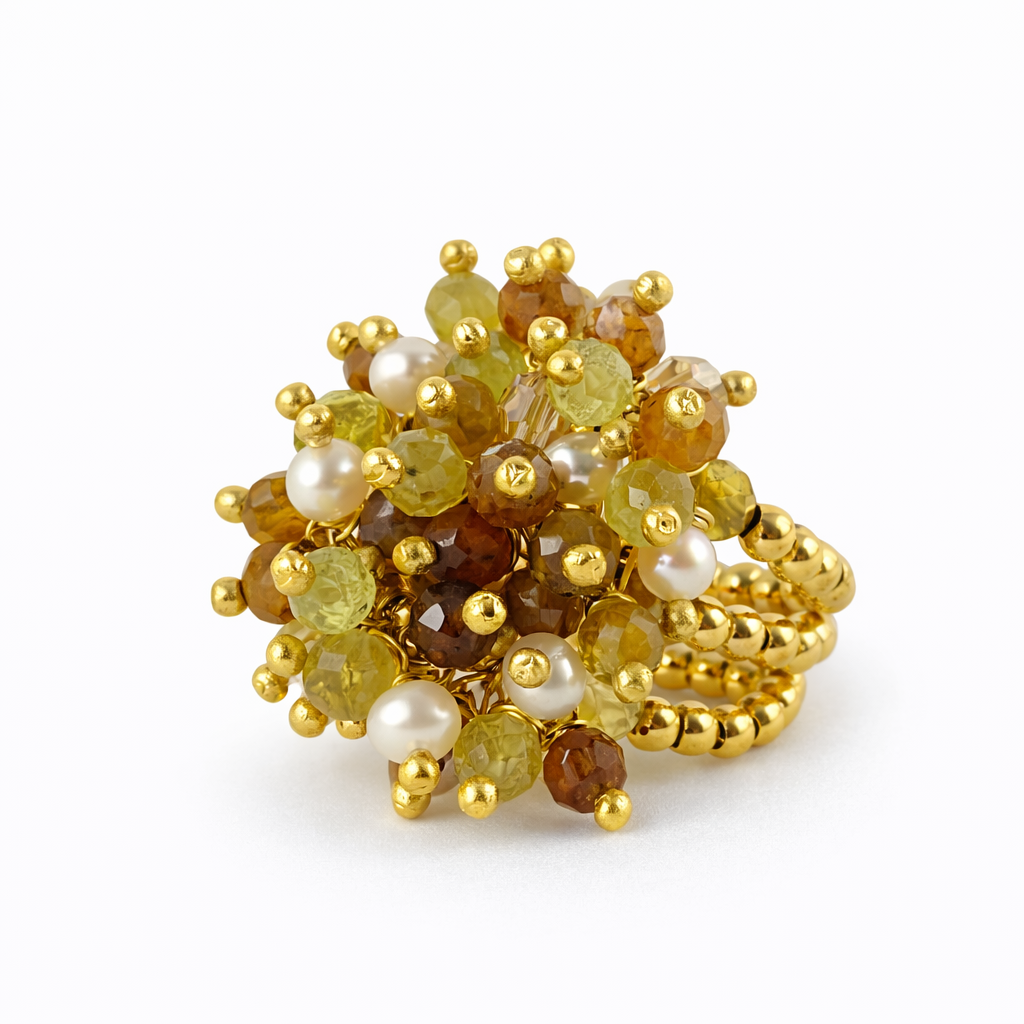 O anel Helia revela uma composição luminosa e sofisticada, onde as nuances douradas das pedras se encontram com o brilho delicado das pérolas, criando uma peça envolvente e cheia de vida.