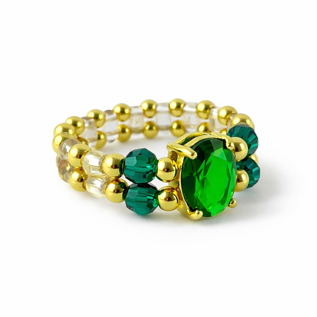 Um verde vibrante e luminoso que destaca a beleza da pedra central. O anel Jadea traz uma zircônia oval verde em evidência, acompanhada por cristais austríacos que acrescentam brilho e profundidade à peça.