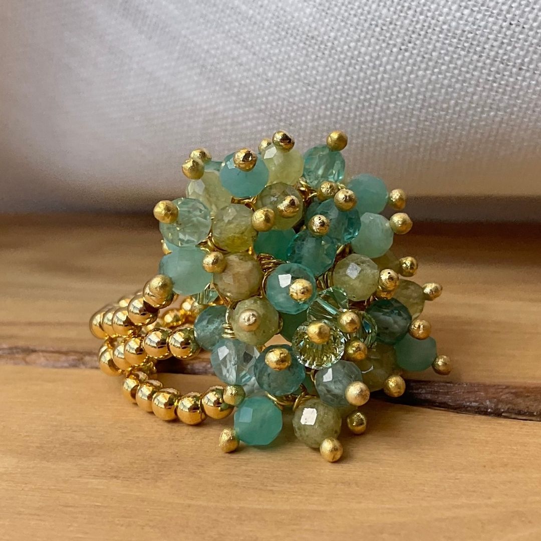 Com tons que evocam as águas esmeraldas da costa italiana, o anel Onda di Smeraldo combina apatita, granada grossular, amazonita e cristais austríacos em um design volumoso e luminoso. Uma peça marcante, cheia de movimento, que traz o frescor do mar para as suas produções.