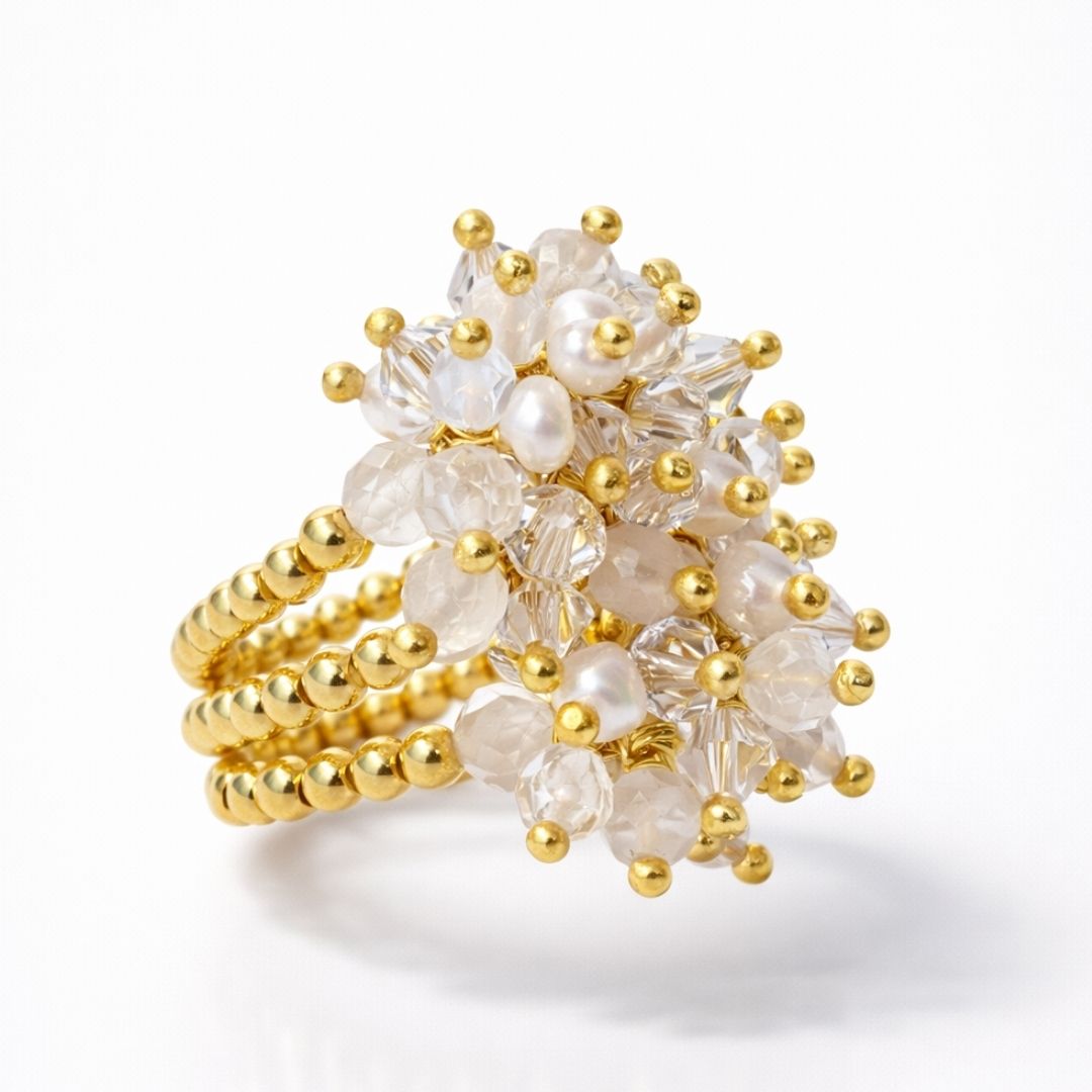 Anel banhado a ouro, com composição rica de pedras da lua, cristais austríacos e pérolas barrocas, formando um volume luminoso que captura a luz em múltiplos reflexos sutis e elegantes.