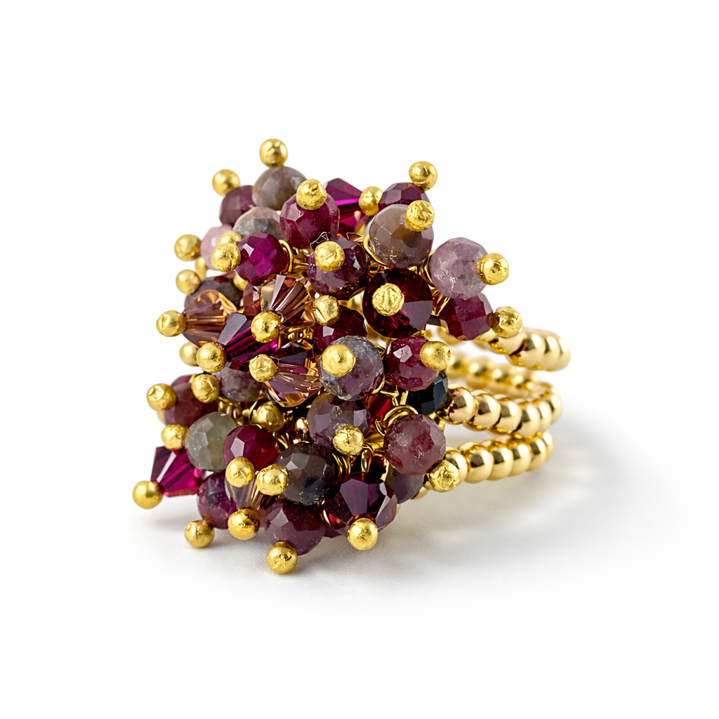 O anel Rubélia revela uma composição intensa e sofisticada, onde o brilho profundo do rubi se destaca em meio aos reflexos elegantes dos cristais austríacos.