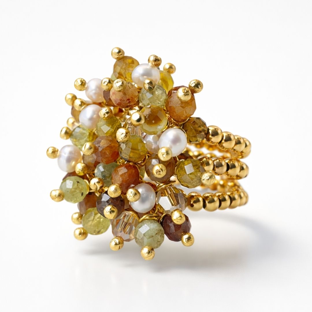 Anel banhado a ouro com uma composição luminosa de granada grossular, safira amarela, pérolas barrocas e cristais austríacos, em tons de mel e dourado que remetem às areias aquecidas pelo sol do Mediterrâneo.