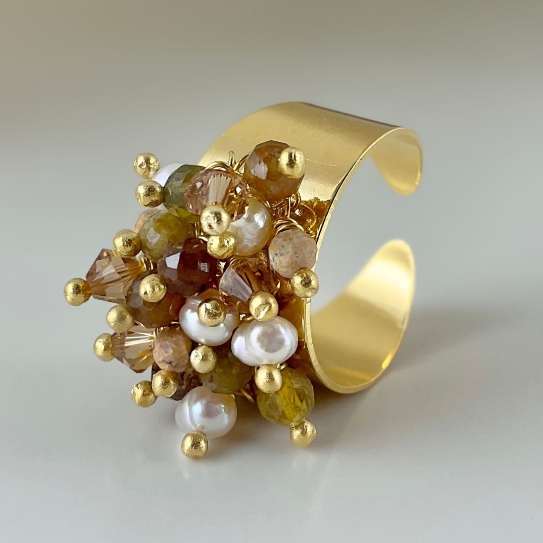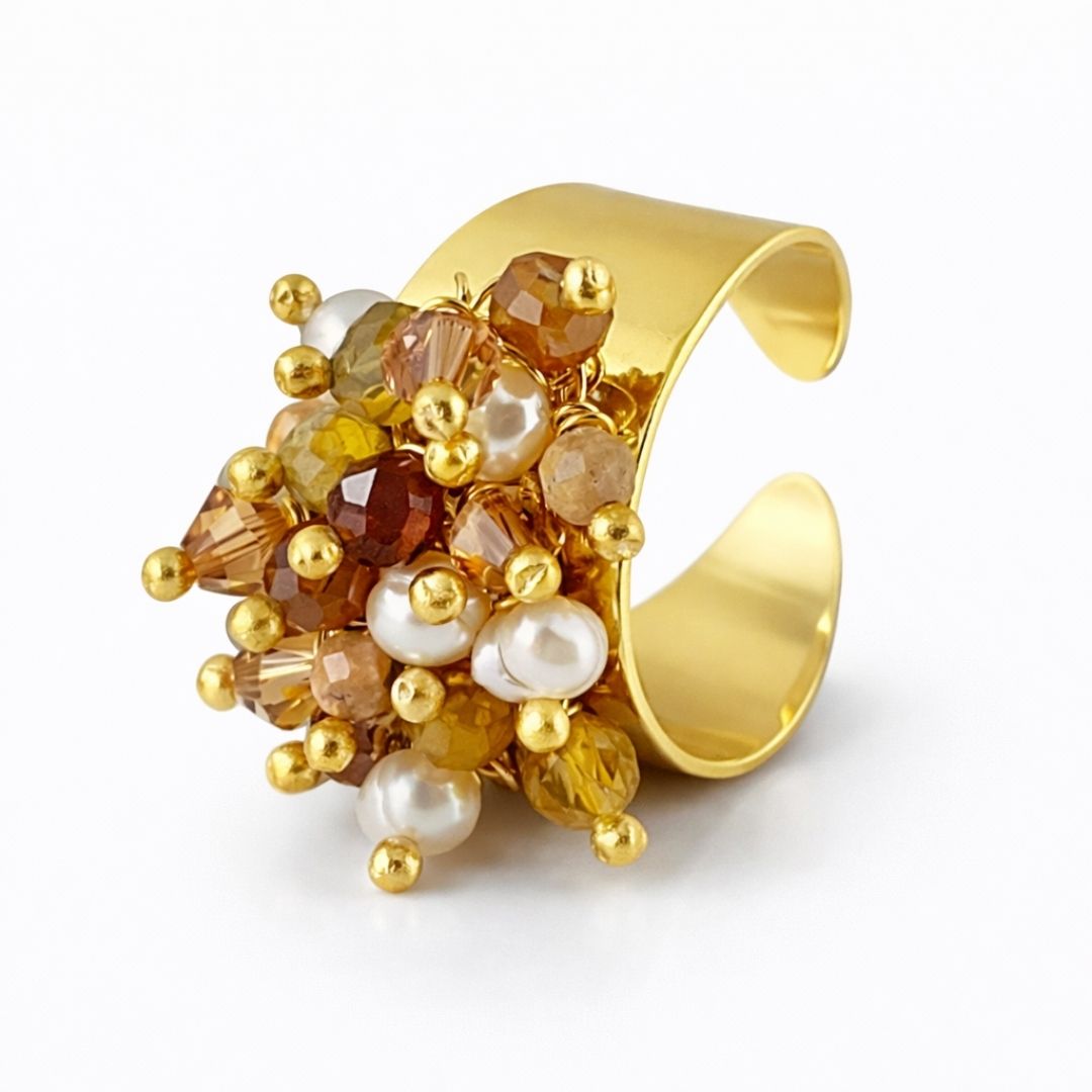 Inspirado na luz dourada que ilumina a costa italiana ao entardecer, o anel Sole della Costiera combina tons de mel, âmbar e dourado em um volume elegante e cheio de presença. As pedras naturais e as pérolas barrocas criam um brilho orgânico que remete ao calor e à sofisticação do Mediterrâneo.