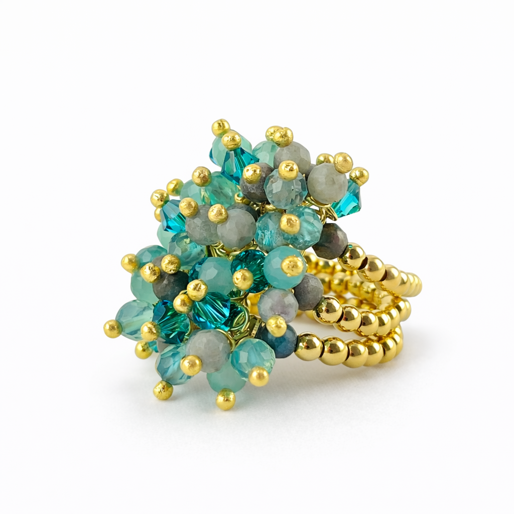 O anel Ventomare traduz a leveza das águas claras em uma composição delicada e luminosa, onde os tons suaves da amazonita se encontram com a intensidade sutil da apatita, criando um equilíbrio sereno e sofisticado.