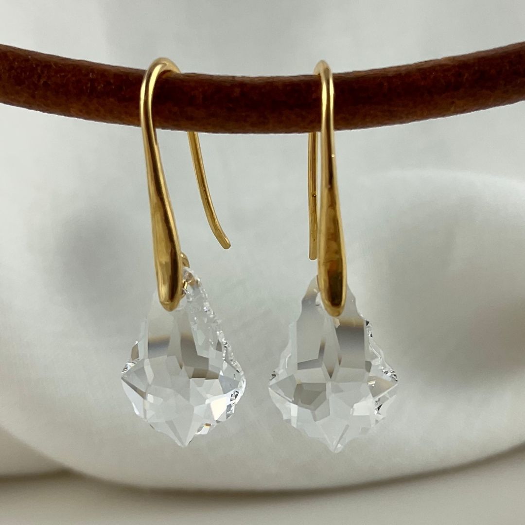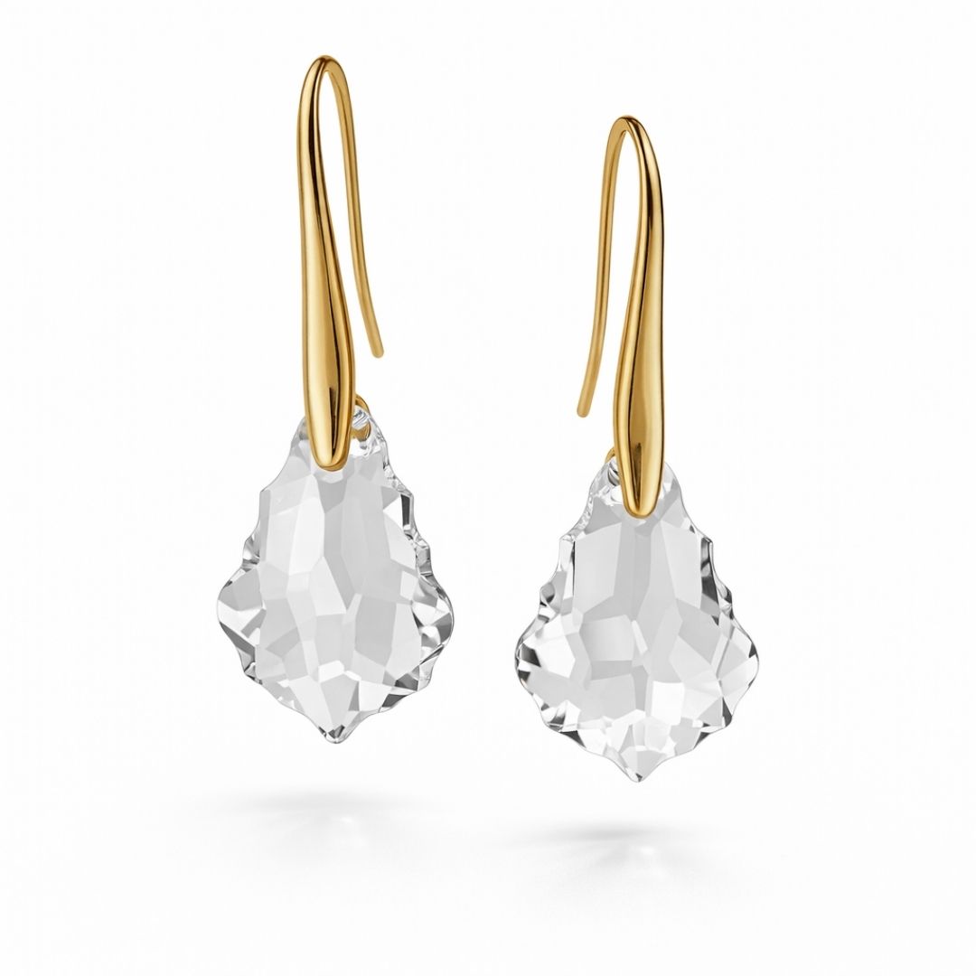 Par delicado e luminoso com cristais austríacos incolores de 16 mm, lapidados para um brilho intenso e sofisticado. O gancho banhado a ouro 18k é leve, elegante e confortável.