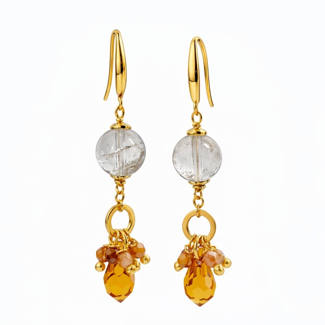 Banhados a ouro com quartzo rutilo e cristal austríaco, em tons quentes que refletem a luz dourada das pedras sob o sol de Luxor.