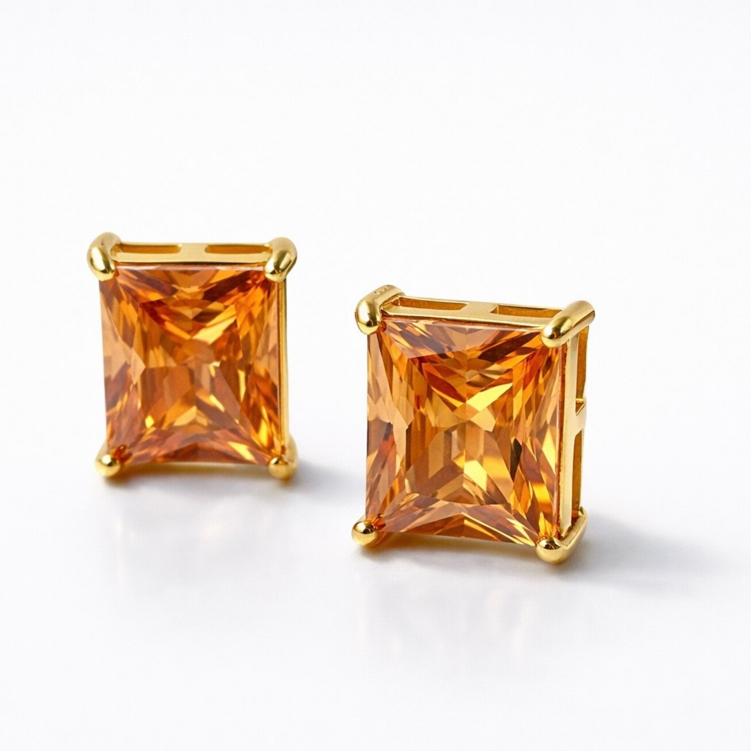 Os Brincos Ambera destacam a luminosidade intensa da zircônia em tom âmbar, com reflexos quentes que transitam entre o dourado e o mel.
