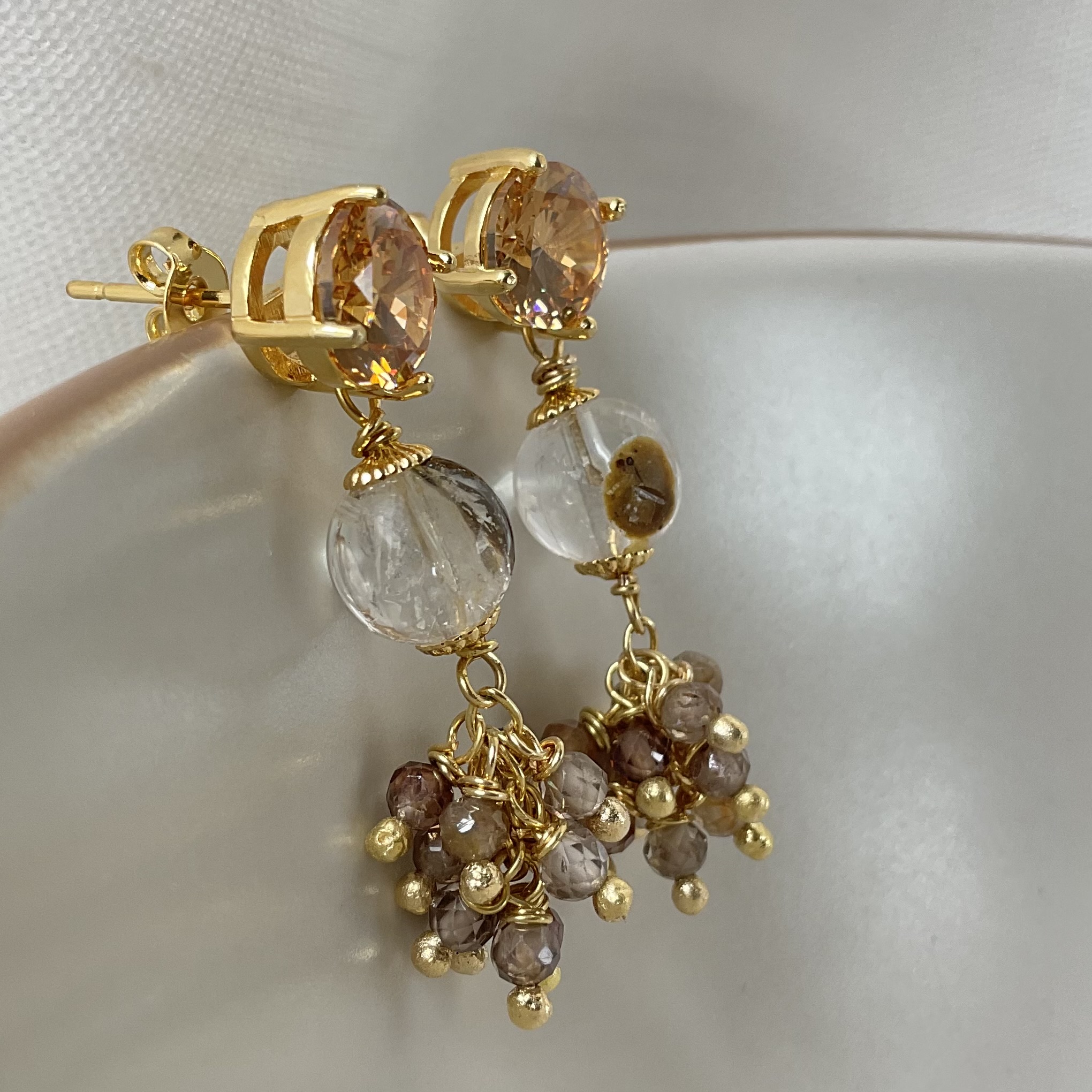Brincos banhados a ouro com quartzo rutilo e cacho de zircão. Na base, zircônia de 8 mm na cor champanhe.