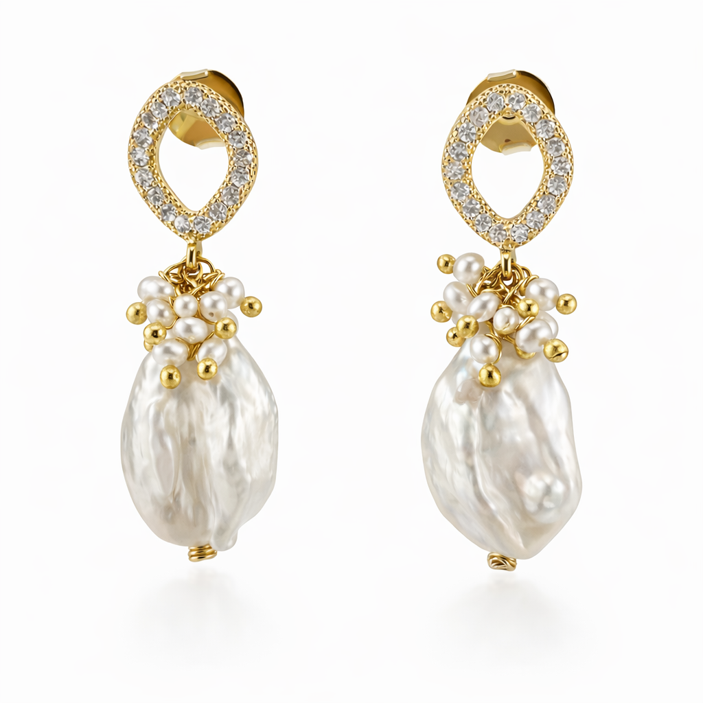 Brincos banhados a ouro com base cravejada de zircônias e pérolas barrocas de brilho natural. Um design elegante e versátil, ideal para iluminar produções do dia a dia a ocasiões especiais.