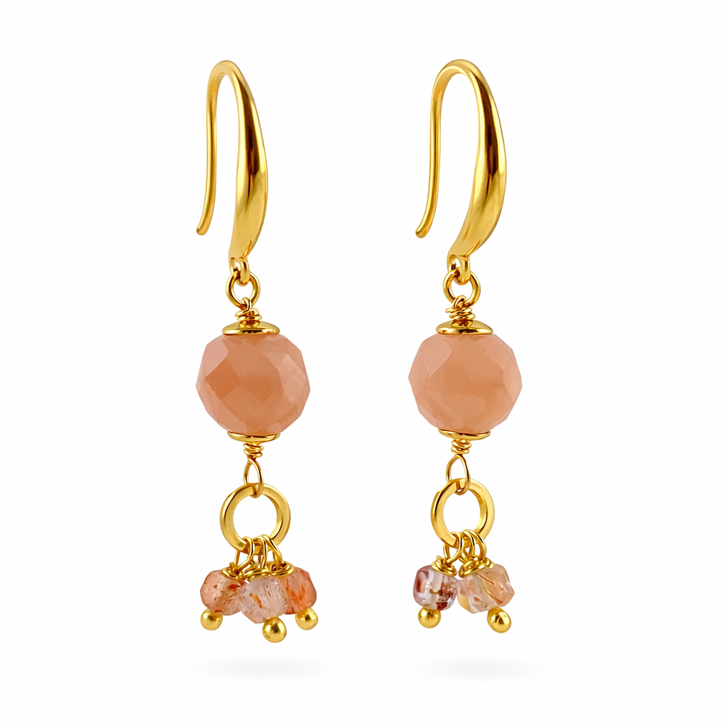 A Pedra do Sol revela tonalidades quentes e luminosas, criando um brilho sutil que ilumina o rosto com naturalidade. O detalhe em cristais acrescenta movimento e leveza, enquanto o acabamento banhado a ouro valoriza a composição com sofisticação.