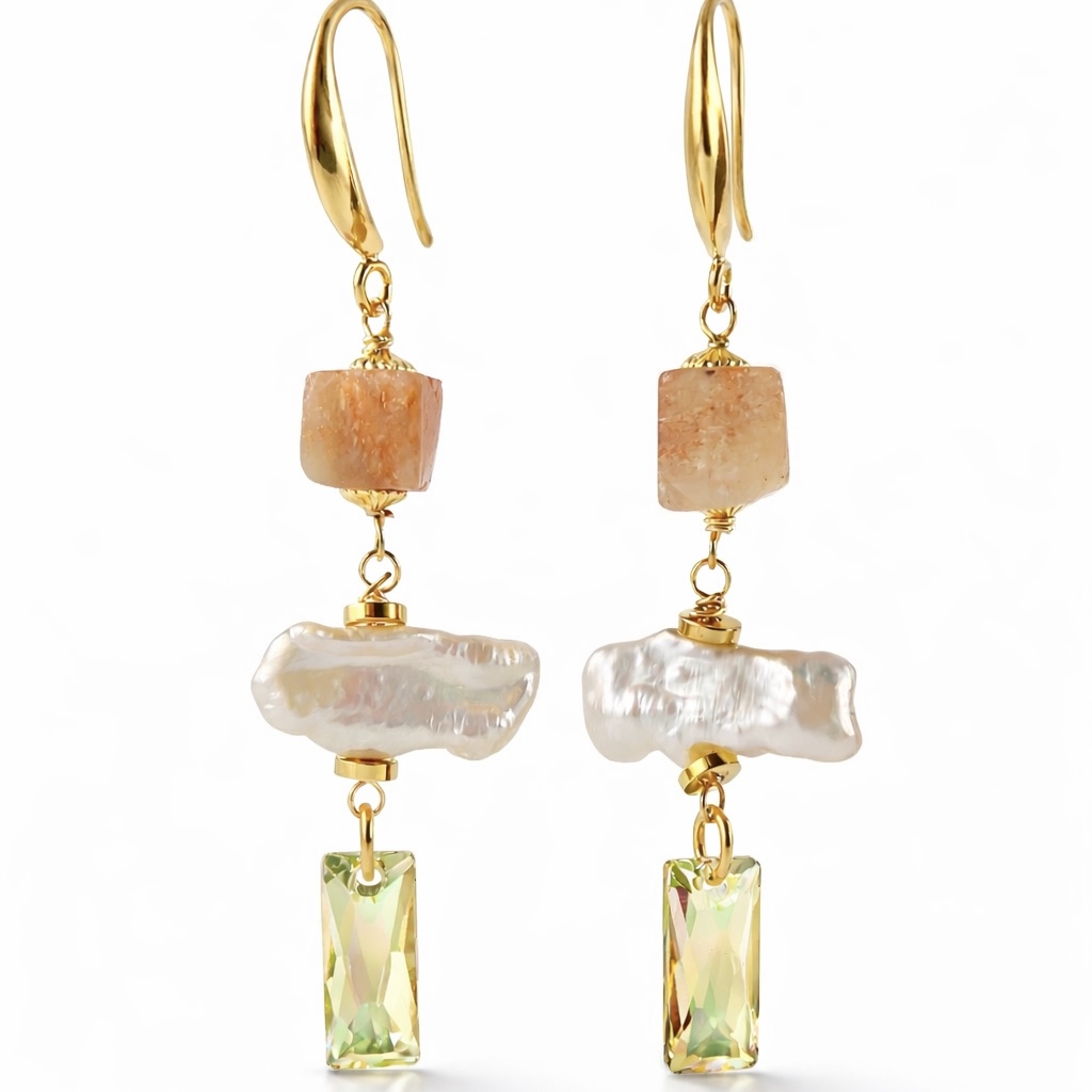 A pedra do Sol revela seus reflexos quentes e delicadamente cintilantes, harmonizando com a beleza orgânica da pérola barroca. O cristal austríaco na tonalidade LUMG completa a peça com um efeito luminoso especial, que varia entre nuances de verde suave, dourado e reflexos iridescentes conforme a incidência da luz.