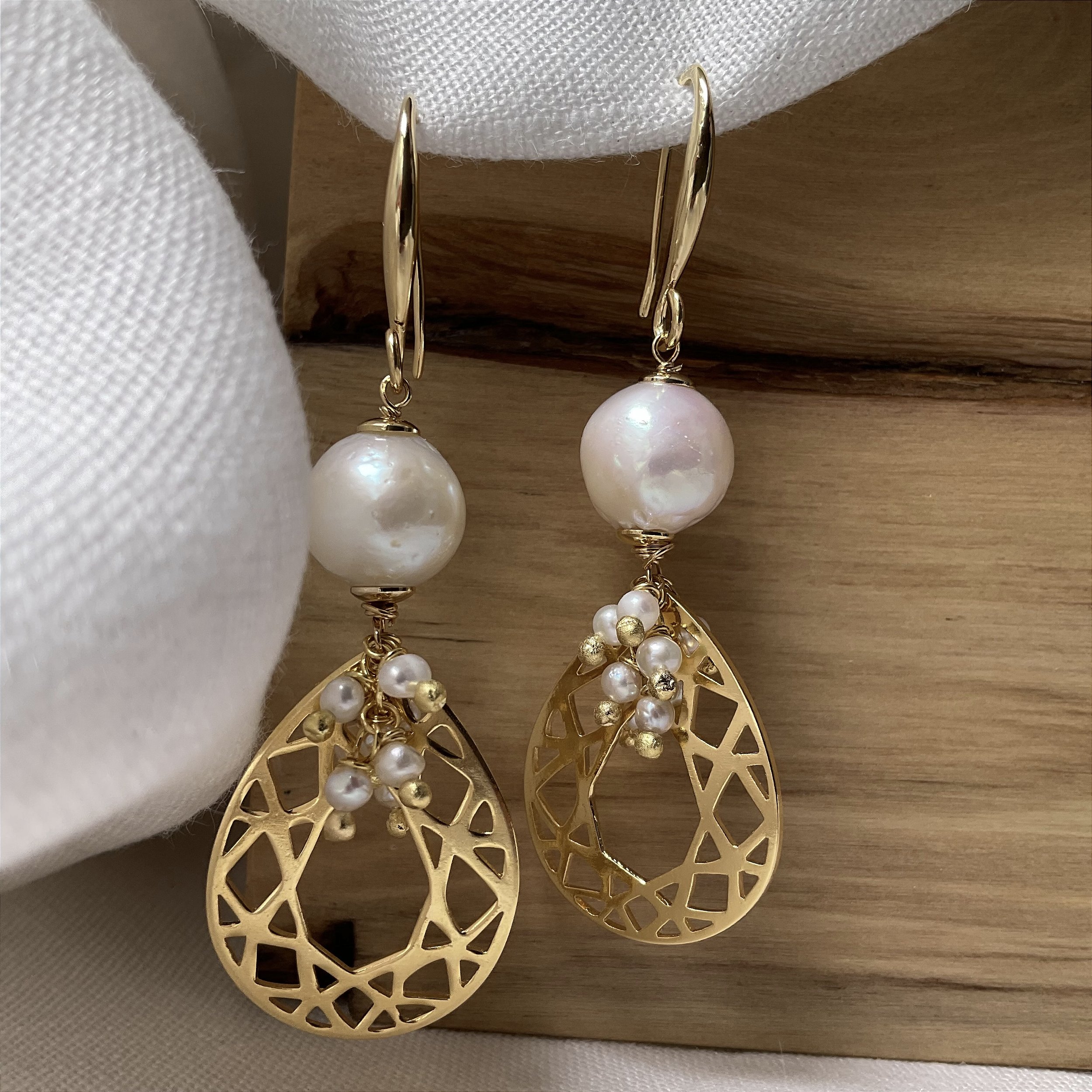 Brincos banhados a ouro 18k com pérolas barrocas de 10mm e delicado cacho de mini pérolas de 3mm, finalizados com pingente vazado em formato de gota.