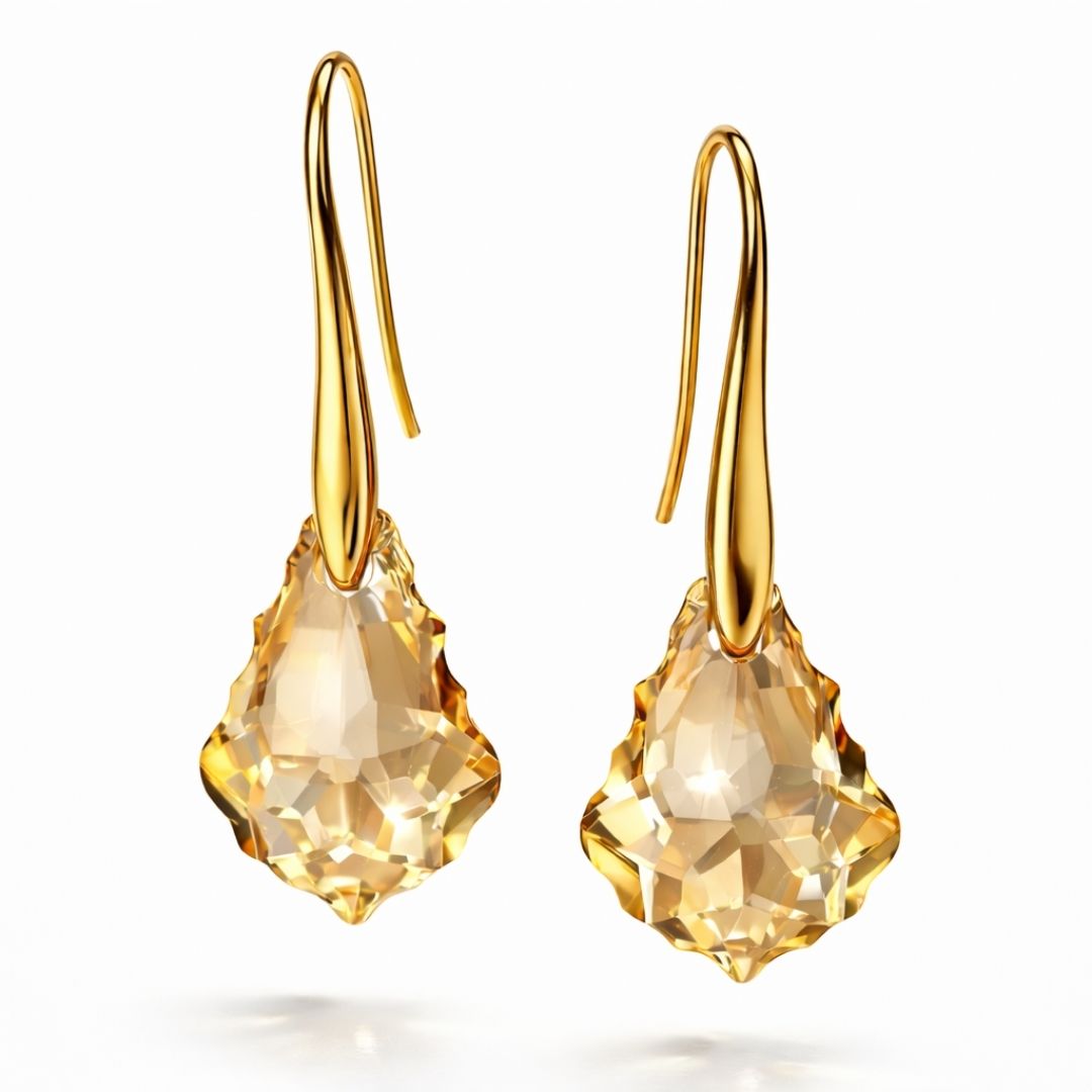Detalhes essenciais: cristal austríaco 16 mm (lapidação facetada); base gancho; banho ouro 18k; comprimento total 3 cm; montagem manual em pequenas séries.