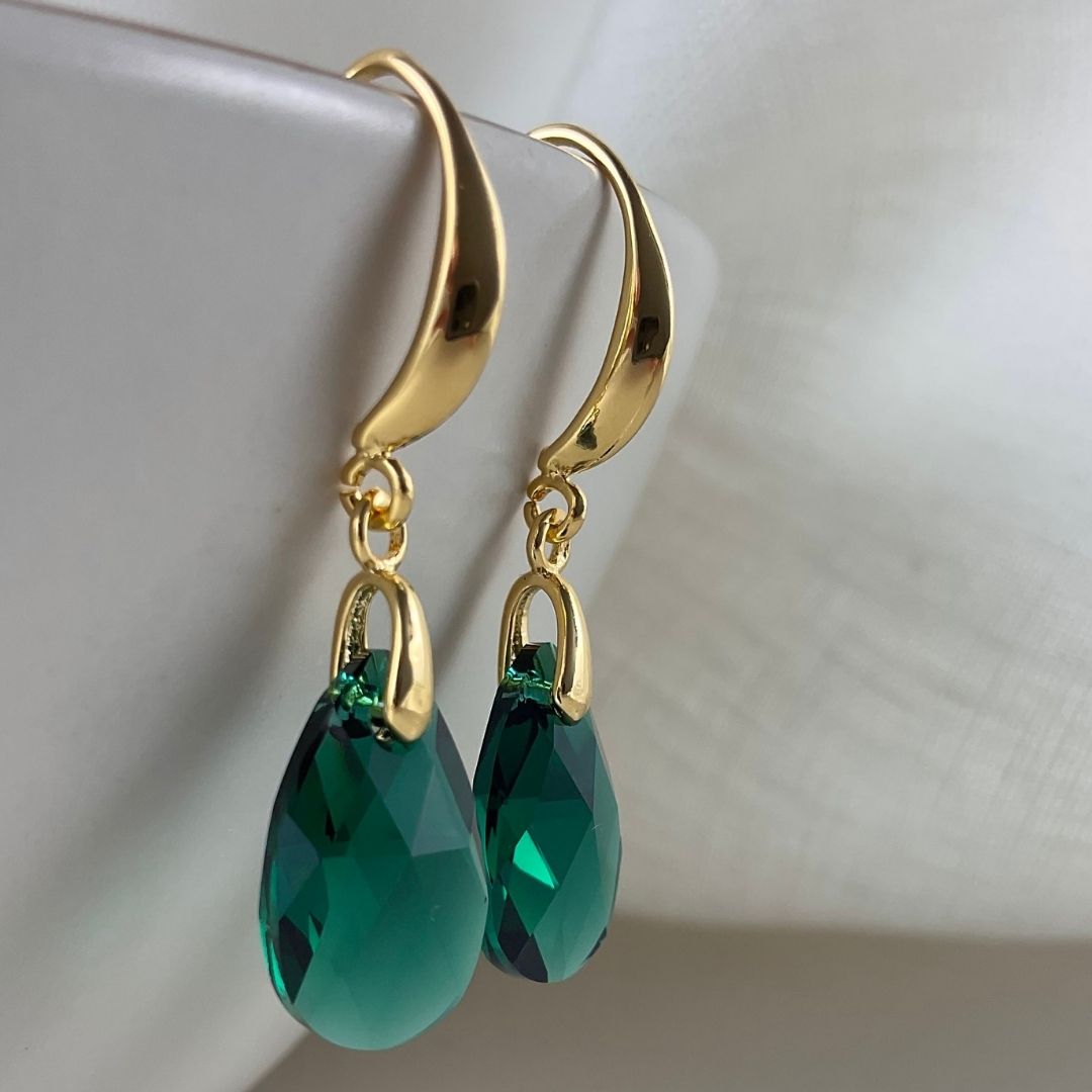 Materiais: banho de ouro 18k, cristal austríaco legítimo na cor esmeralda, lapidação gota 16 mm.