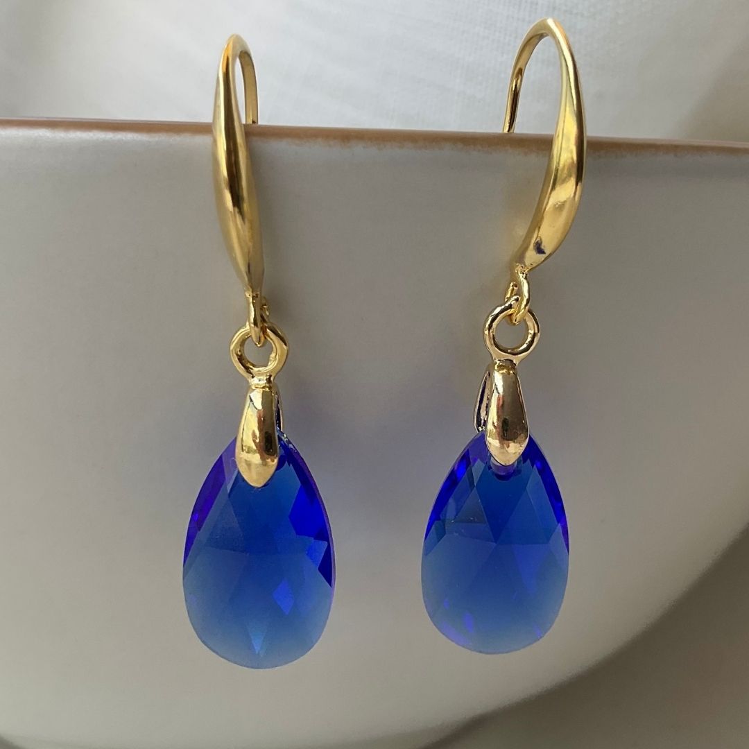 Brincos banhados a ouro 18k com cristal austríaco Majestic Blue de 16mm — um azul profundo que lembra a intensidade das águas mediterrâneas ao entardecer, com transparência impecável e brilho de lapidação premium.