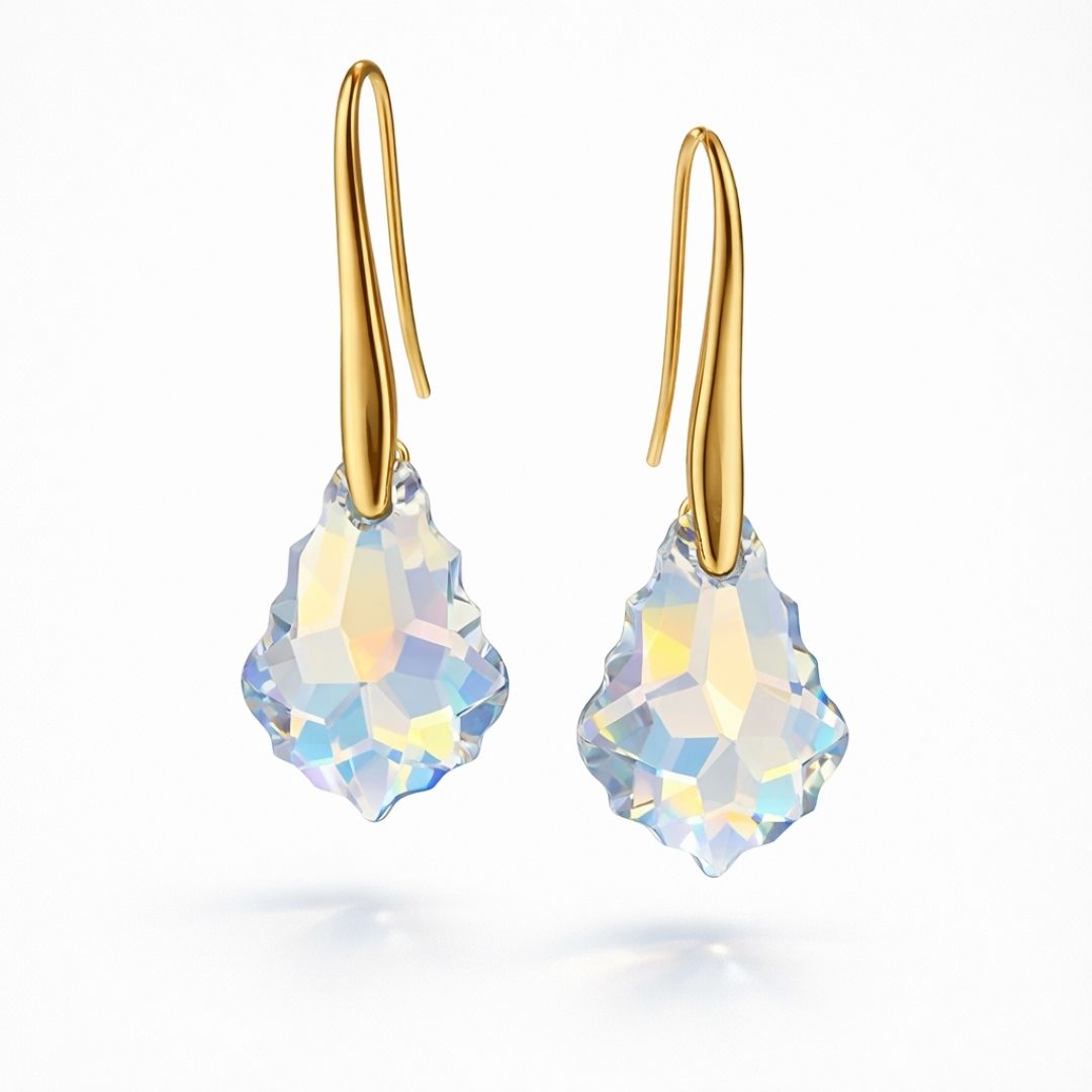 Par de brincos estilo gancho (sem trava), banhados a ouro 18k, com cristal austríaco de 16 mm na cor Boreal — leves, elegantes e surpreendentes.