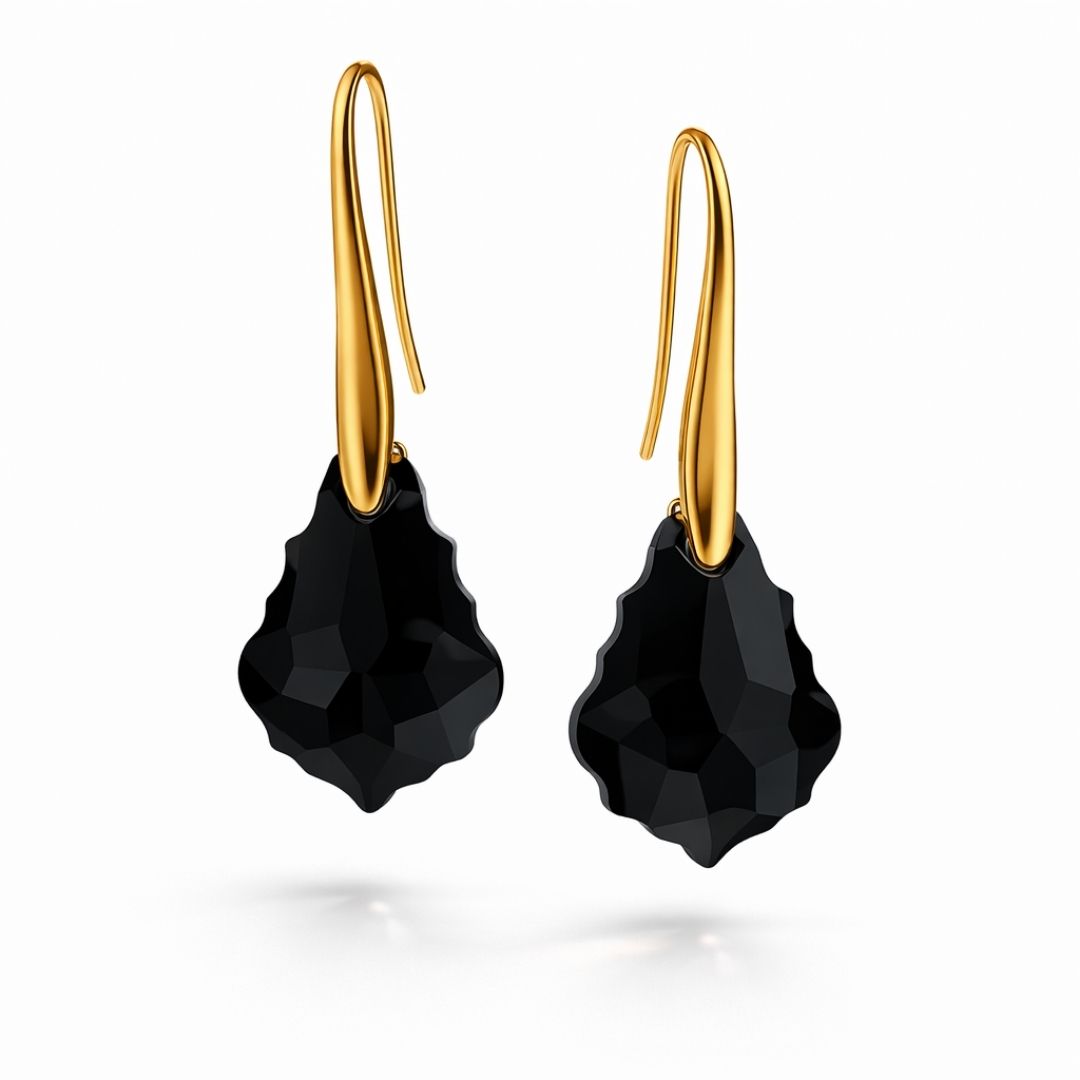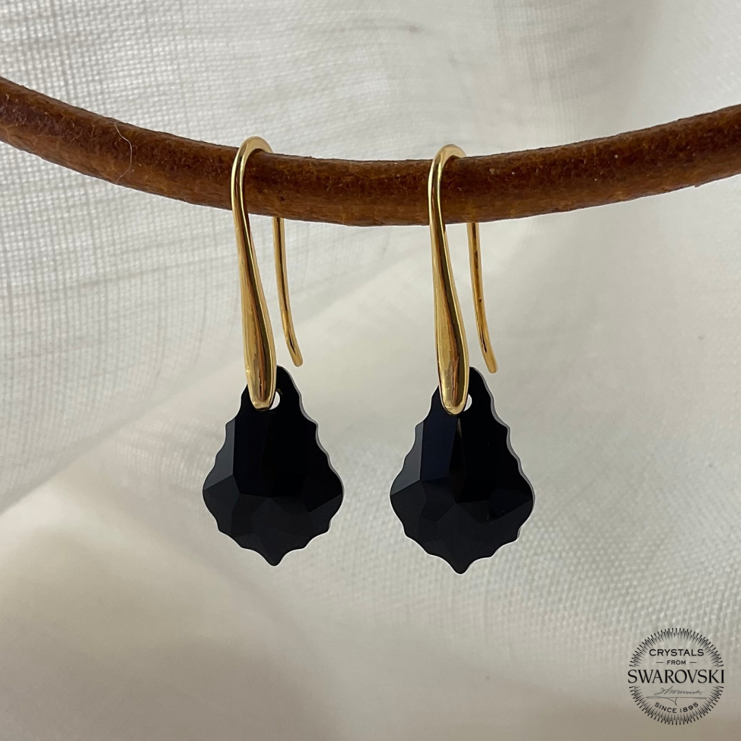 Brincos da coleção Kristallwelten, banhados a ouro 18k e finalizados com cristal austríaco preto de 16 mm.