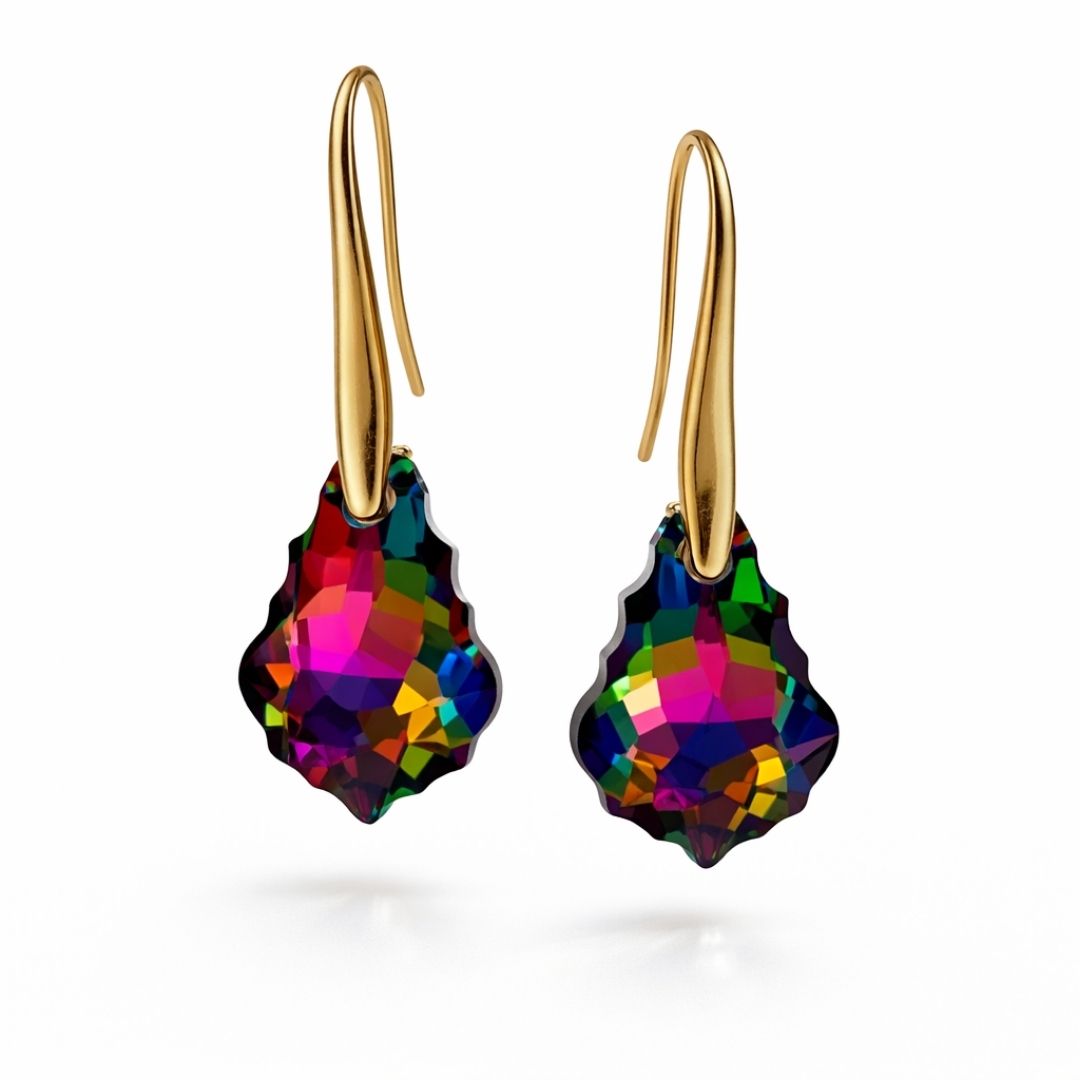 Detalhes essenciais: cristais austríacos em formato barroco; comprimento total 3 cm; banho ouro 18k hipoalergênico; gancho confortável; montagem manual em pequenas séries.