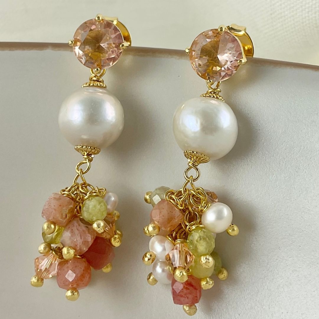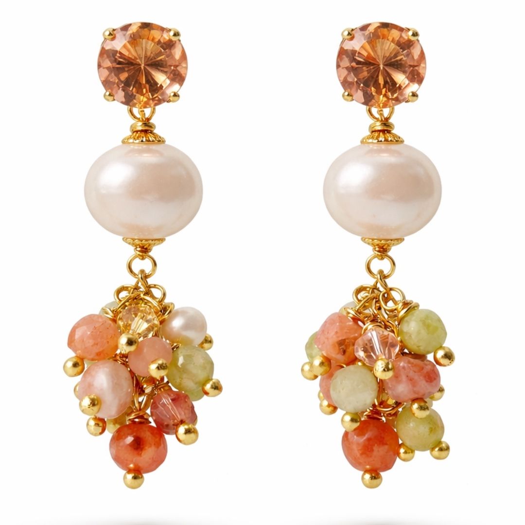 Brincos banhados a ouro com pedras da lua, granada grossular e pérolas barrocas. A base traz uma zircônia no tom champanhe (8 mm), que ilumina e aquece a peça com elegância.