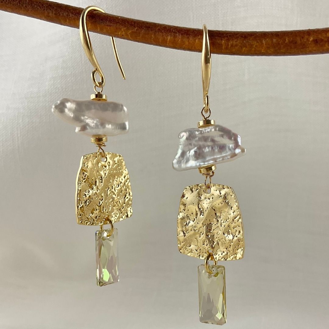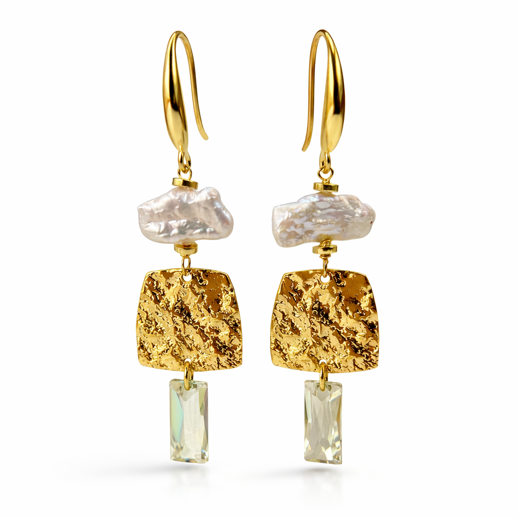Brincos banhados a ouro 18k com pérolas barrocas (10/20mm) e cristal austríaco de 12mm. Ao centro, uma placa dourada de textura artesanal, inspirada nas fachadas históricas de Amalfi.