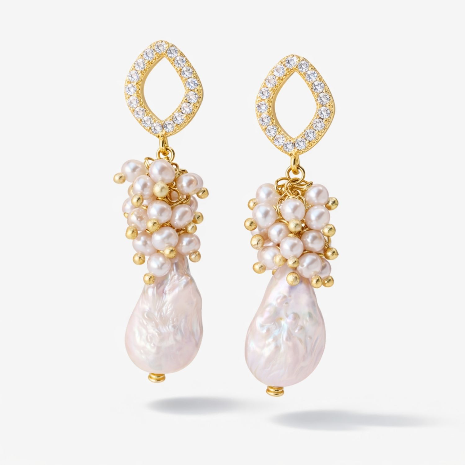 Brincos banhados a ouro com base cravejada de zircônias e composição de pérolas barrocas que formam um volume elegante e orgânico. A pérola central, de formato único, acrescenta movimento e sofisticação à peça.