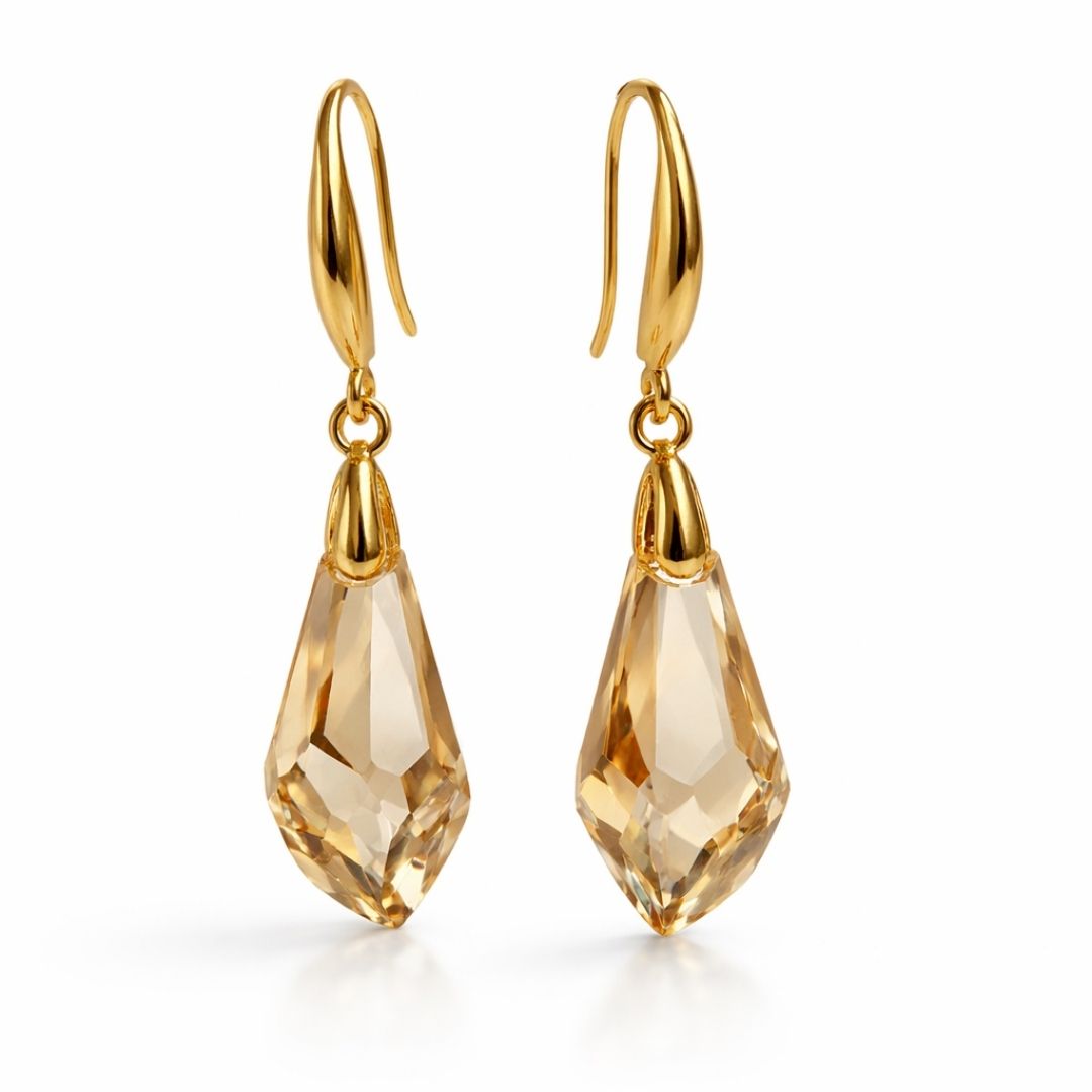 Brincos Facette destacam a beleza da lapidação precisa, que reflete a luz de forma suave e sofisticada. O cristal austríaco na tonalidade golden shadow revela nuances quentes e luminosas, com profundidade e elegância.