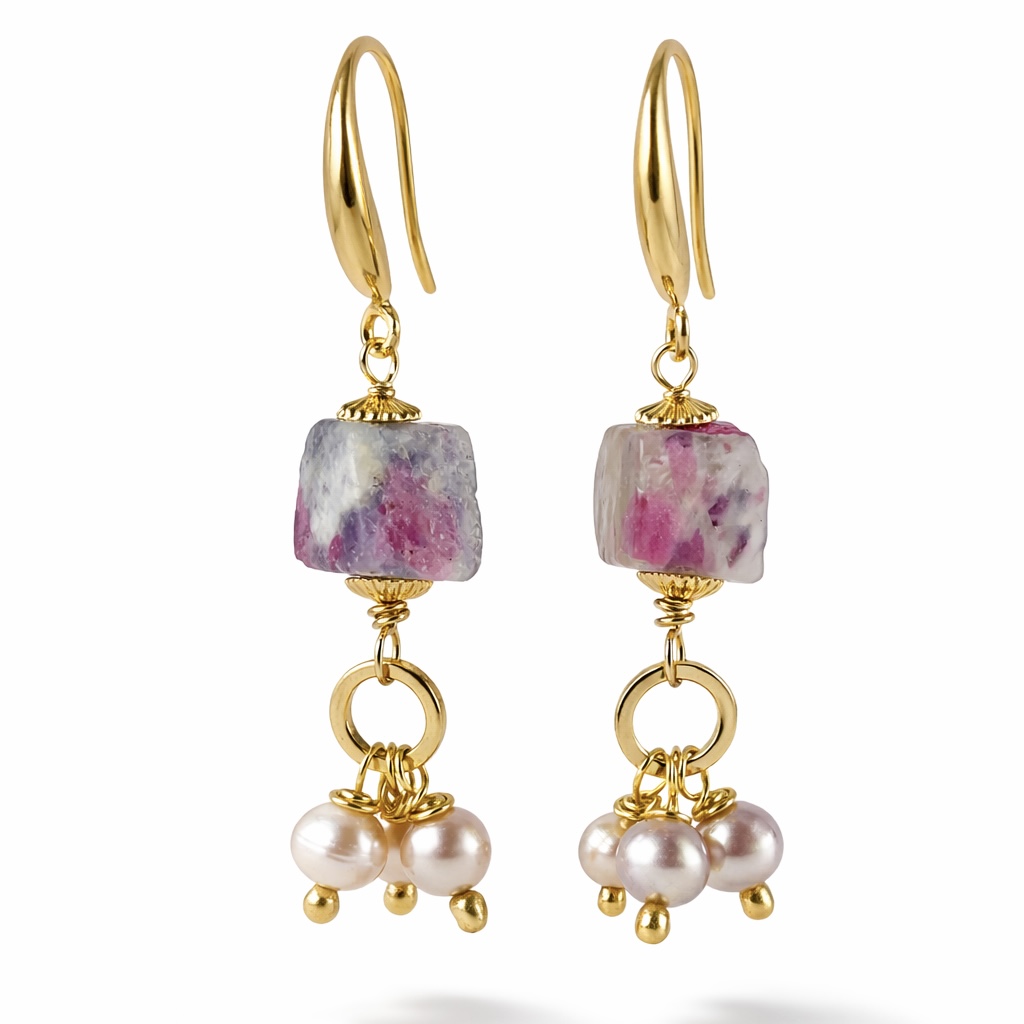 Brincos banhados a ouro com turmalina e pérolas barrocas rosadas. Um desenho leve e autoral, com brilho sutil e acabamento premium.