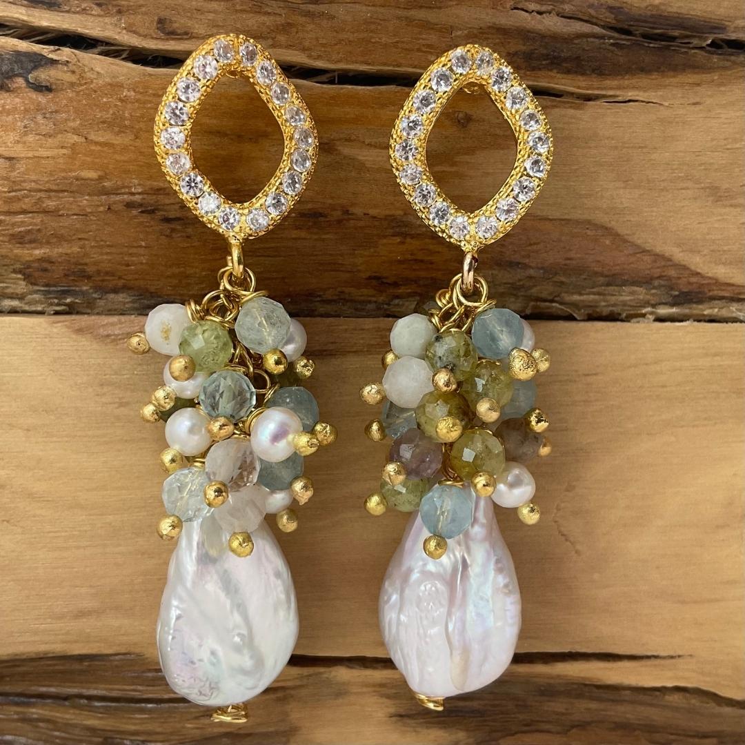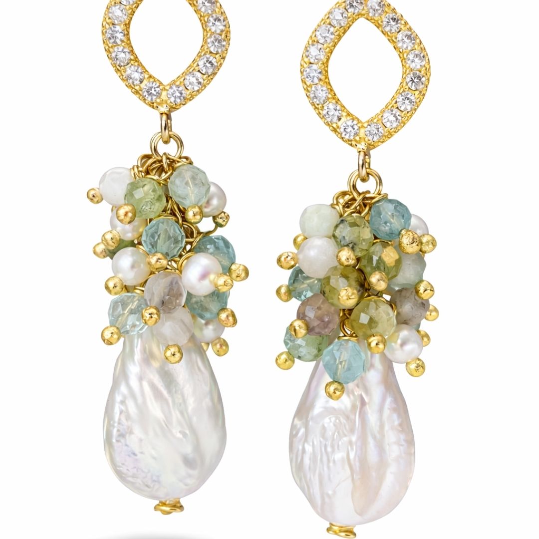 Brincos banhados a ouro com a harmonia luminosa de granada grossular, água-marinha, pérolas barrocas e cristais austríacos. Na ponta, uma pérola Biwa confere movimento orgânico e um brilho singular. A base é delicadamente cravejada de zircônia.