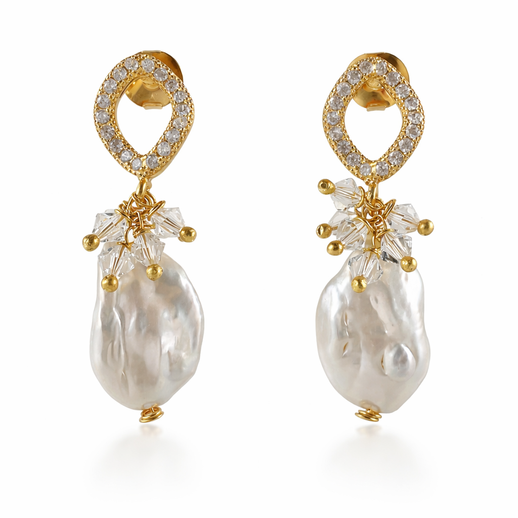 Brincos com pérolas barrocas de formato orgânico, base banhada a ouro cravejada de zircônias e delicado cacho de cristais austríacos. Uma peça elegante que ilumina o rosto com leveza e presença.
