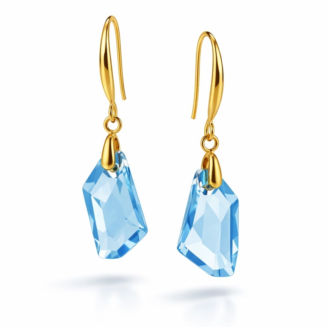 Brincos banhados a ouro com cristal austríaco na cor Aquamarine, lapidado em formato angular, com facetas marcadas que refletem a luz de forma intensa e sofisticada.