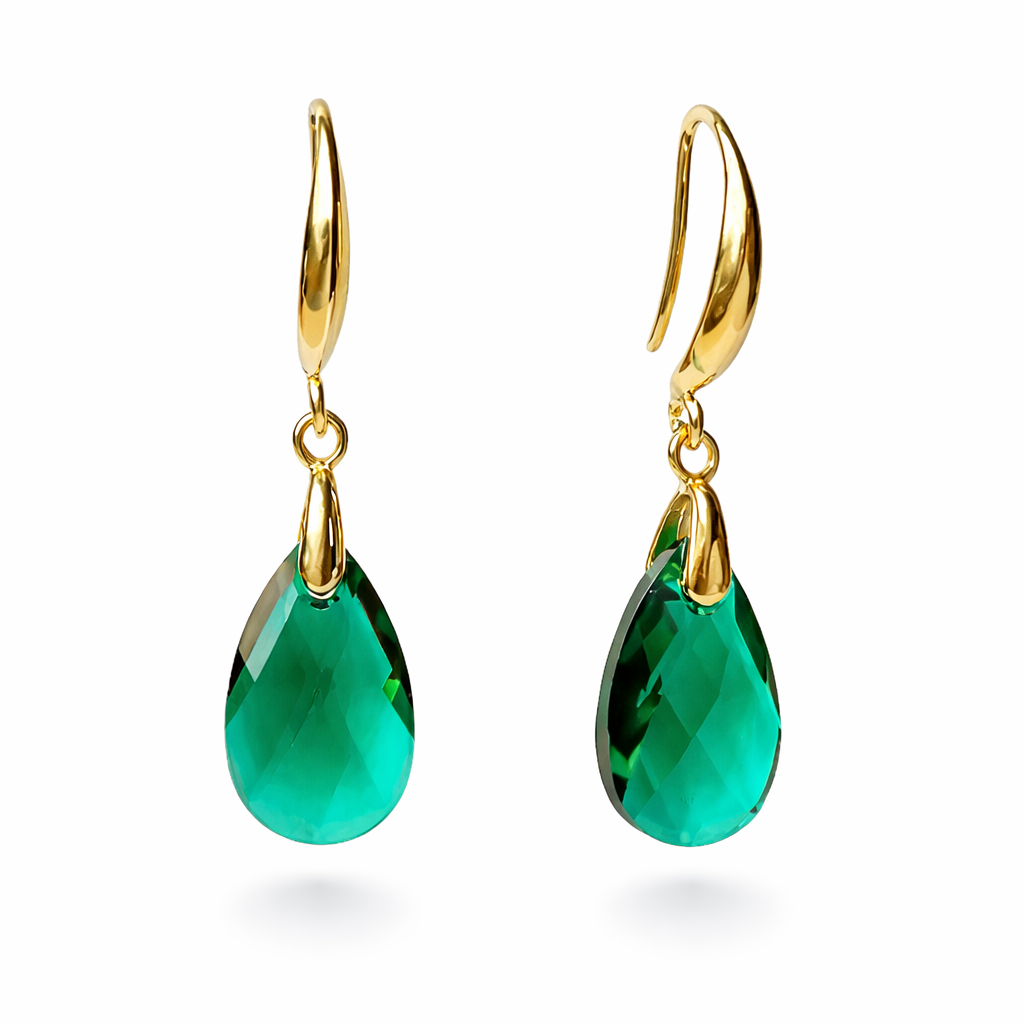 O cristal austríaco na tonalidade esmeralda revela um verde profundo e vibrante, inspirado na riqueza das pedras preciosas. Sua transparência e lapidação em gota permitem que a luz atravesse o cristal, criando reflexos intensos e um brilho elegante que valoriza o rosto com naturalidade.