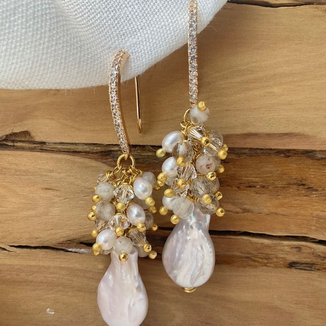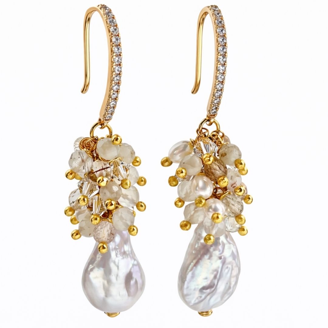 Brincos banhados a ouro 18k com pedra da lua, quartzo rutilo e pérolas barrocas delicadamente entrelaçadas. Na ponta, uma pérola Biwa de brilho orgânico e superfície escultural, que reforça o caráter artístico e único da peça.
