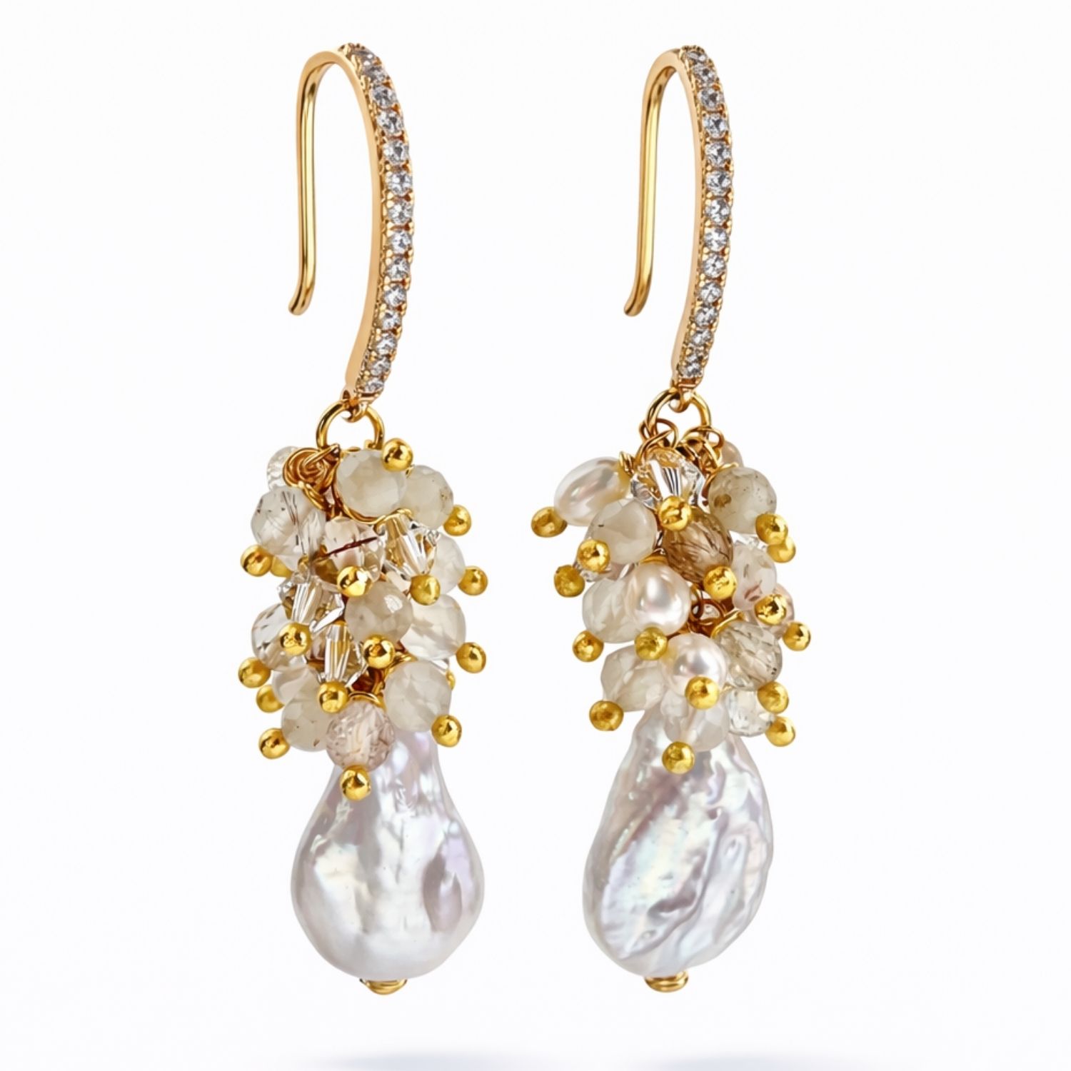 Os Brincos Lucea combinam a beleza orgânica das pérolas barrocas com os reflexos sutis do quartzo rutilo e o brilho delicado dos cristais austríacos.