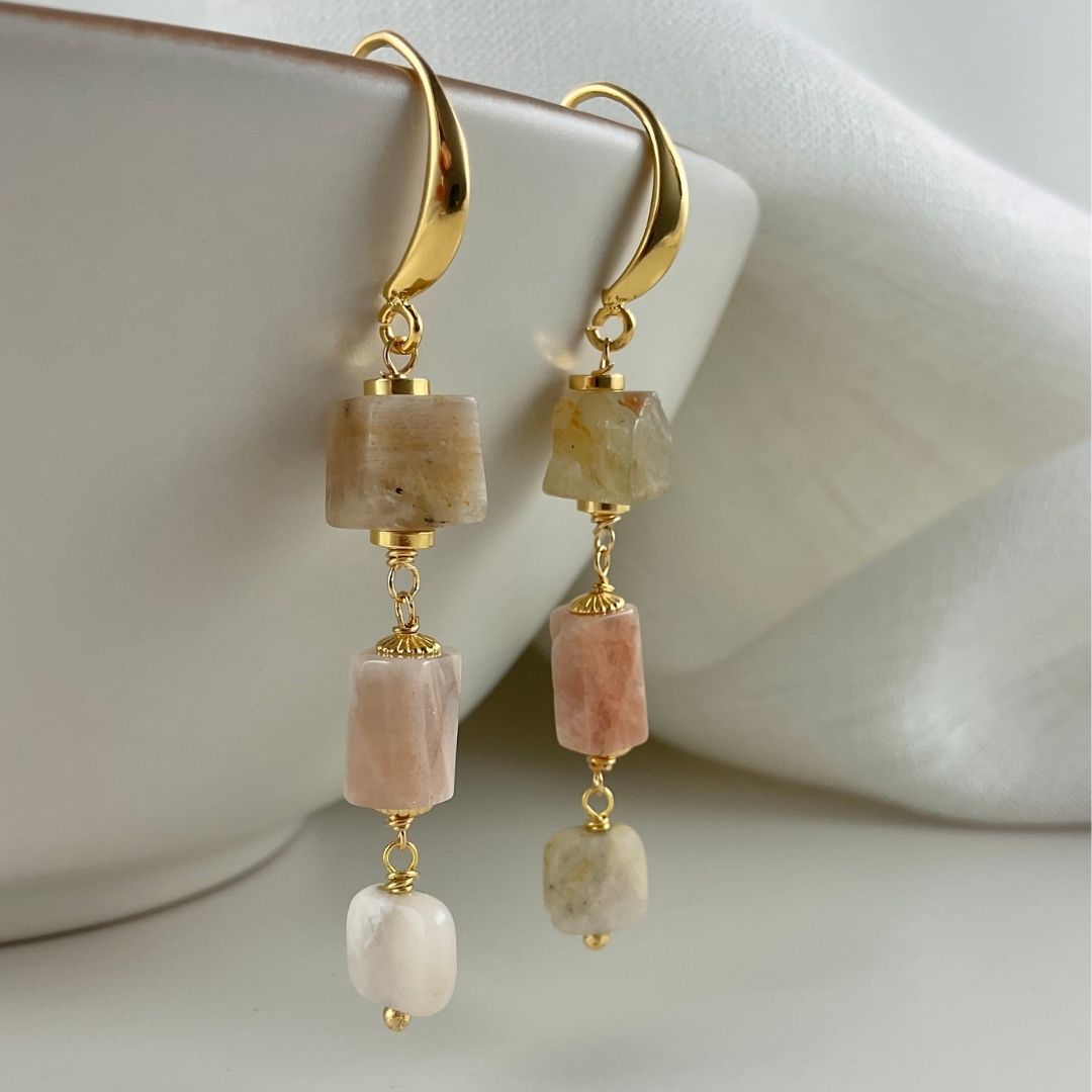 Materiais: brincos banhados a ouro com Pedra do Sol, Pedra da Lua rosada e opala rosa.