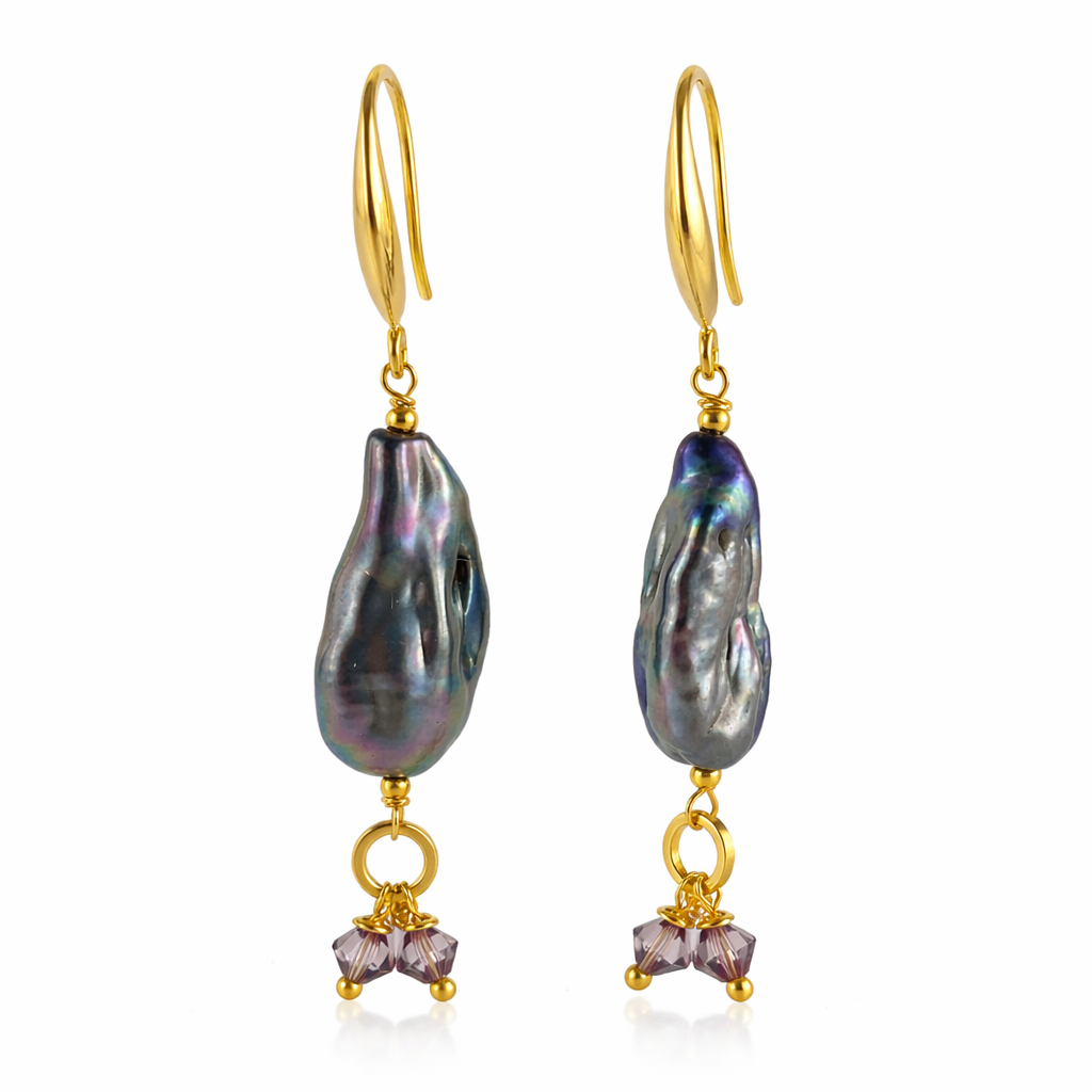 As pérolas negras revelam reflexos iridescentes que variam conforme a luz, criando um efeito sofisticado e envolvente. O detalhe em cristais austríacos acrescenta movimento e brilho sutil, equilibrando intensidade e delicadeza.