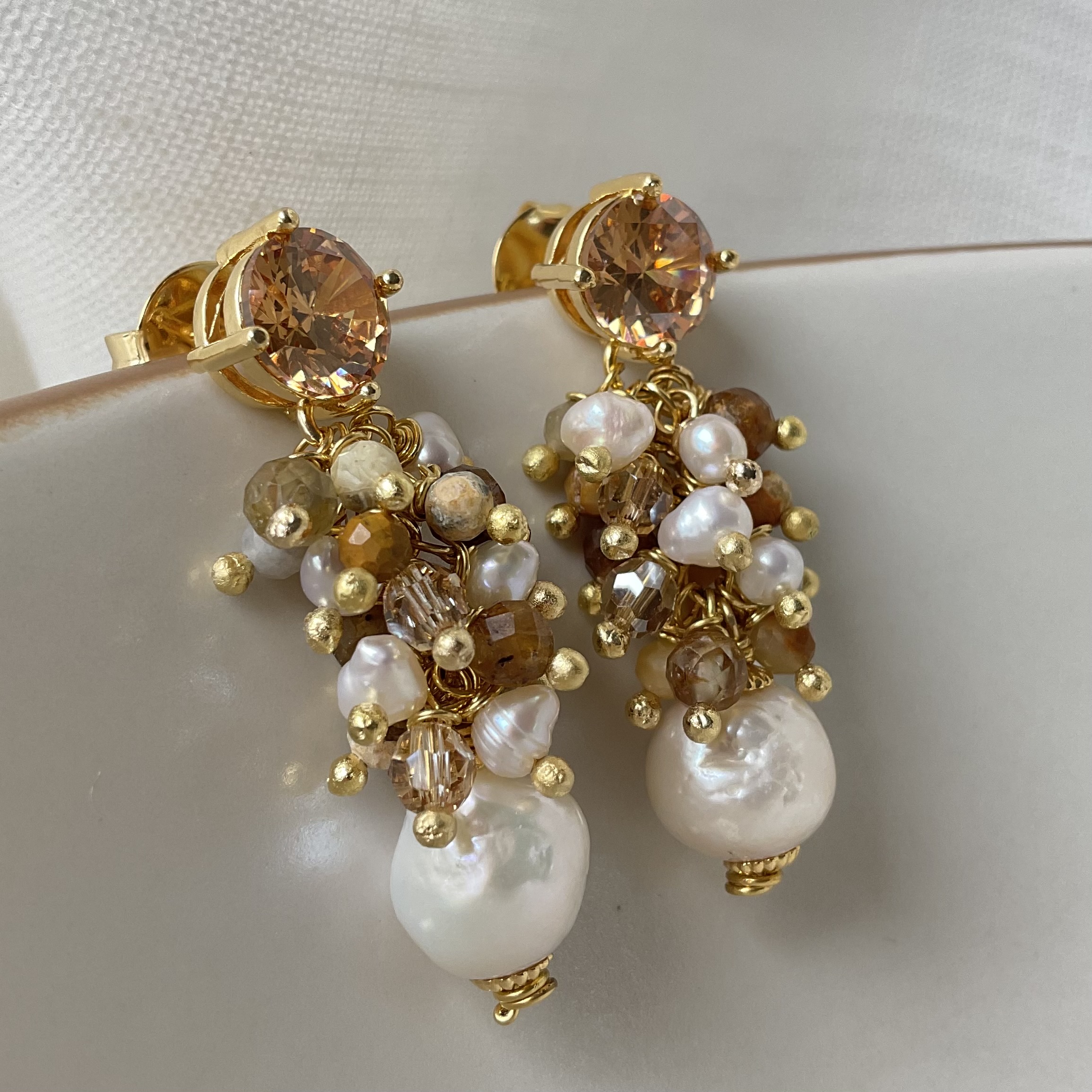 Brincos banhados a ouro 18k com safira amarela, feldspato, ágata de renda, pérolas barrocas e cristais austríacos.