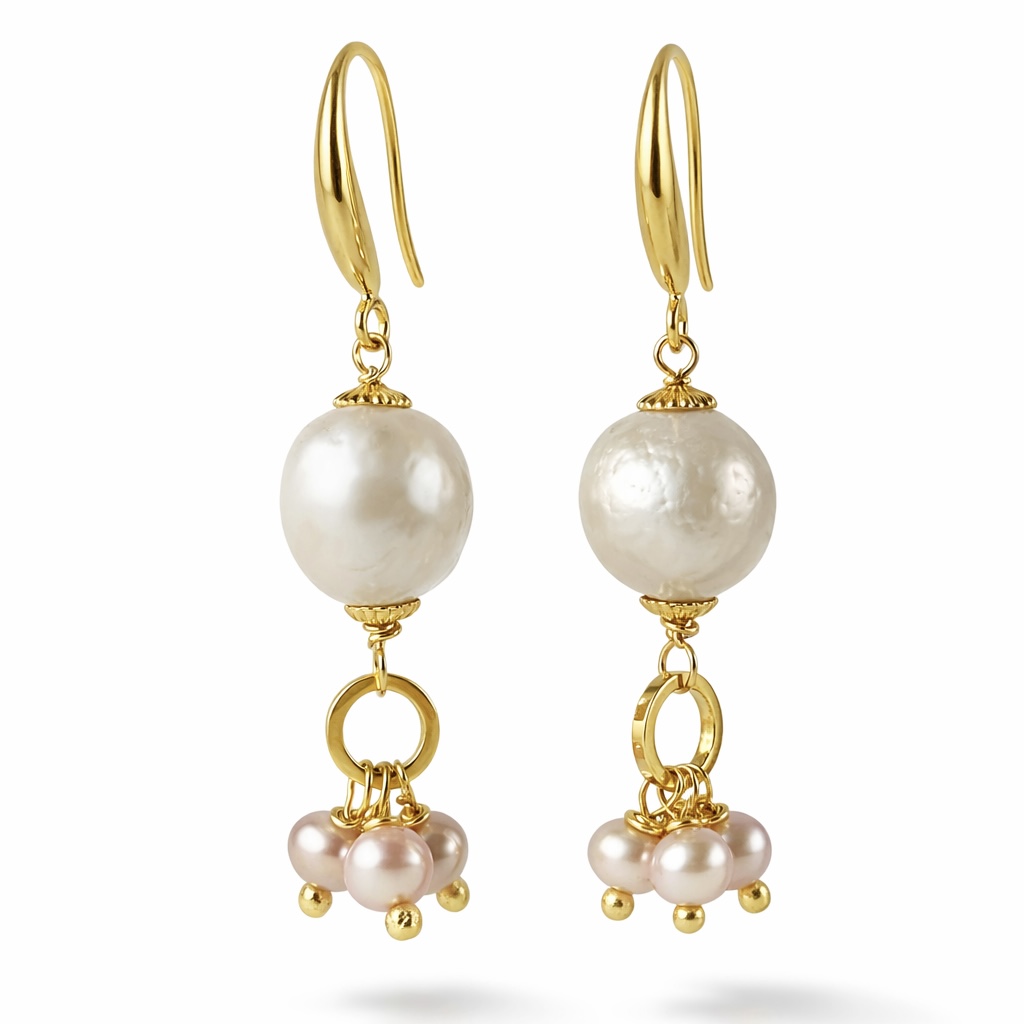 Brincos banhados a ouro com pérolas barrocas claras e pérolas barrocas rosadas, em um design que valoriza as formas naturais e o brilho suave das pérolas.