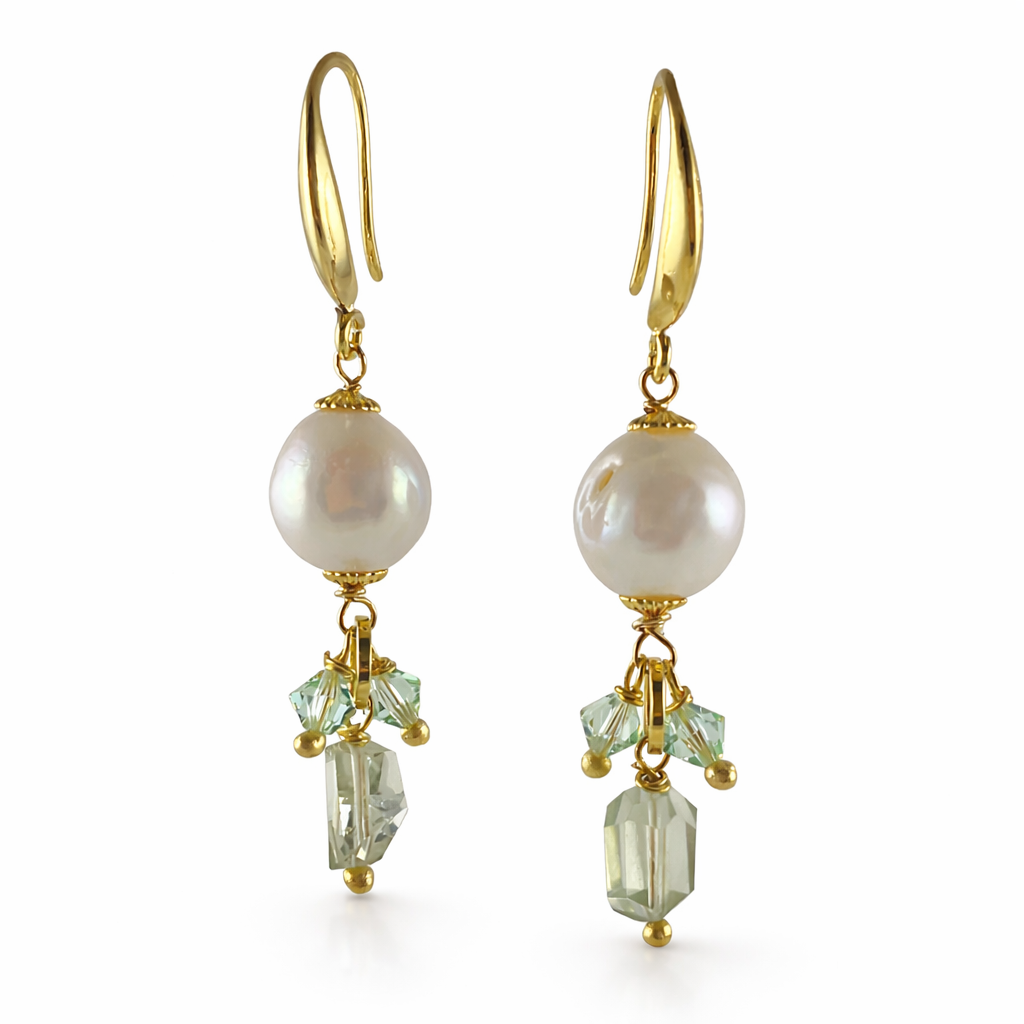 Os Brincos Prasia combinam a elegância clássica das pérolas com a leveza luminosa da prasiolita, conhecida como ametista verde. Pequenos cristais austríacos acrescentam movimento e brilho delicado à composição.