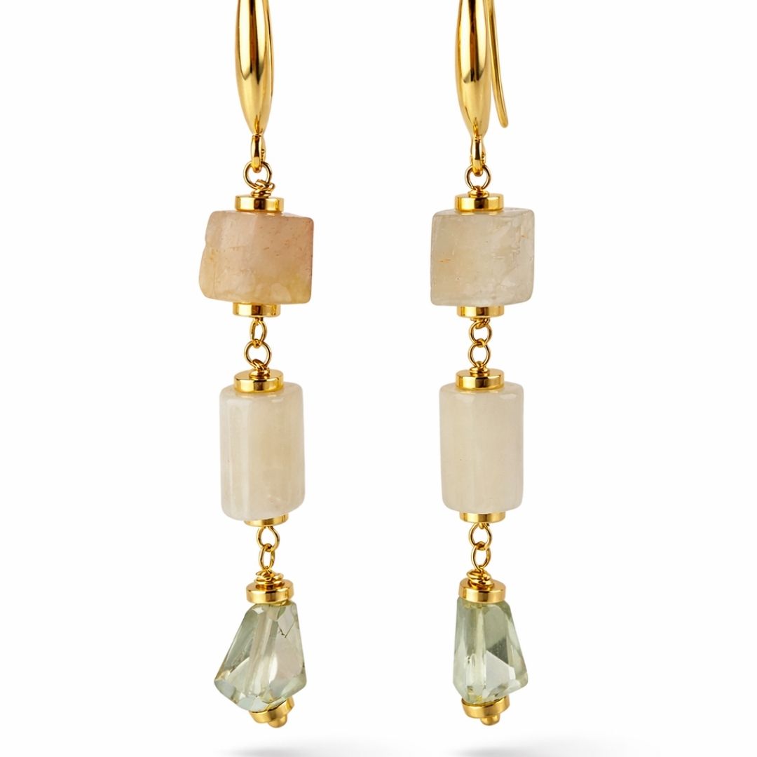 Uma combinação que equilibra calor e suavidade: a Pedra do Sol, com seus reflexos discretamente dourados, encontra a serenidade leitosa da Pedra da Lua, enquanto a prasiolita finaliza com um verde claro translúcido, elegante e luminoso. Um brinco alongado, leve e naturalmente sofisticado.