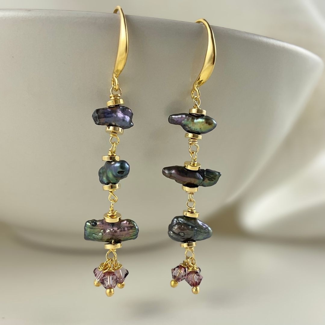 Brincos banhados a ouro com pérolas barrocas negras e cristais austríacos na ponta — uma composição leve, esvoaçante e com brilho profundo que reflete as cores do mar ao entardecer.