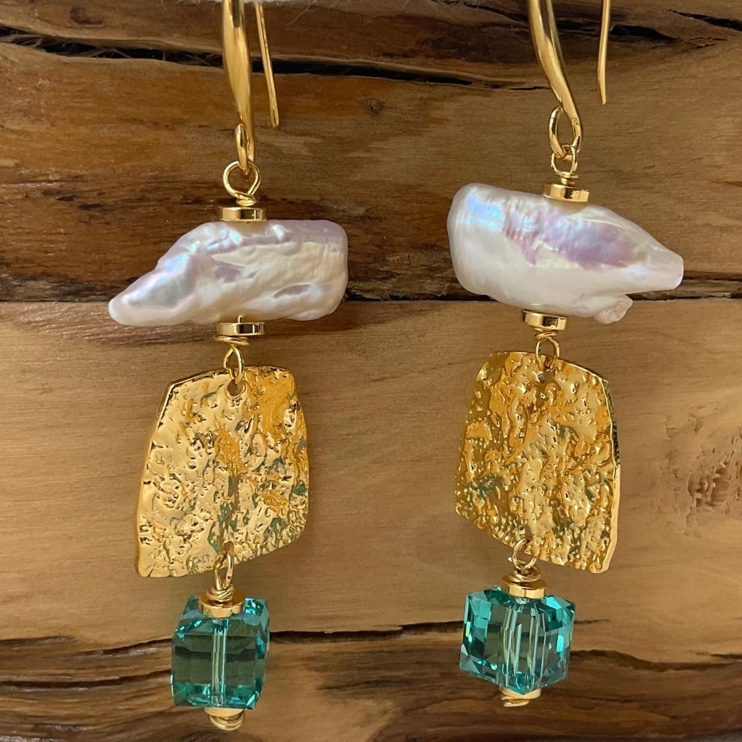 Brincos banhados a ouro com pérolas barrocas de água doce, detalhe martelado em ouro (2 cm) e um cristal austríaco na vibrante cor turquesa, que ecoa o azul translúcido do Mediterrâneo.