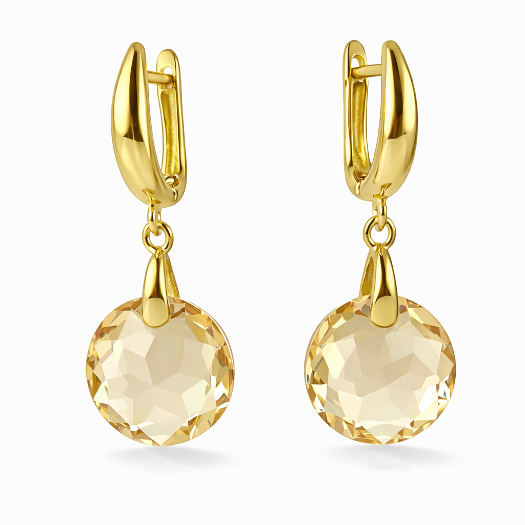 A lapidação circular de 14 mm potencializa a refração da luz, revelando nuances translúcidas e douradas que valorizam tanto produções diurnas quanto noturnas. O resultado é uma peça clássica, atemporal e extremamente versátil, perfeita para quem busca elegância com sutileza.