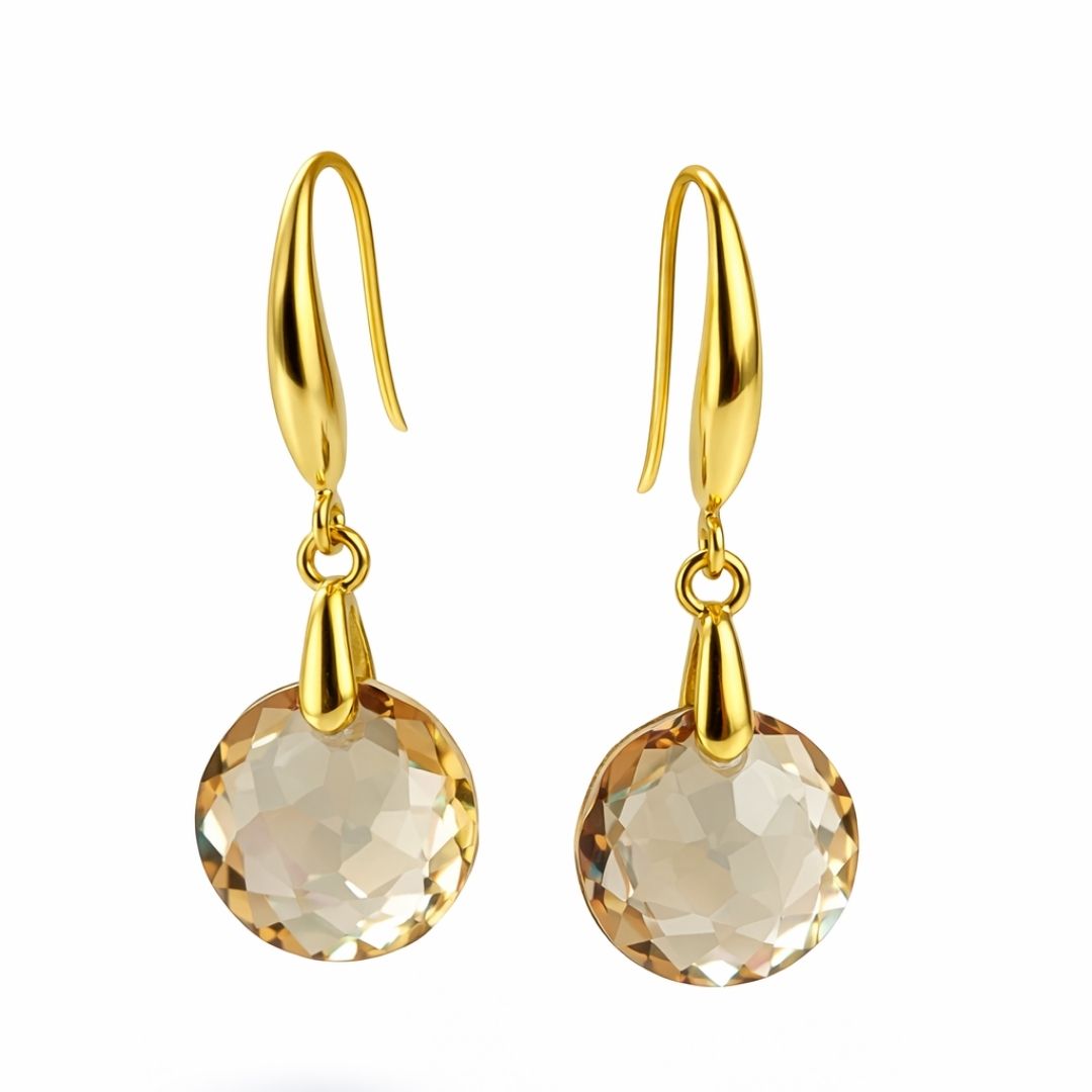 Os brincos Strahlen da coleção Kristallwelten destacam o cristal austríaco na cor Golden Shadow, conhecido por seu tom sofisticado entre o dourado suave e o champagne. Essa cor possui um brilho elegante e aveludado, com reflexos quentes que variam conforme a luz, criando profundidade e um efeito luminoso discreto — nunca excessivo.